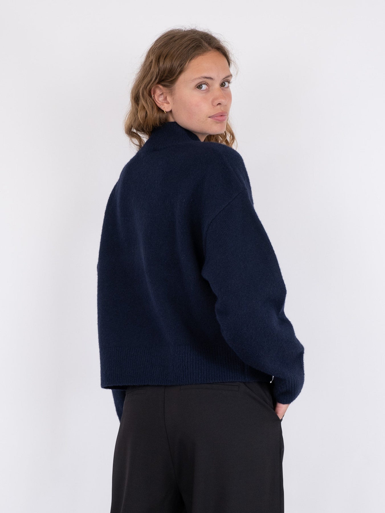 Gebreide trui in donkerblauw van Neo Noir met hoge hals en cropped lengte. Het heeft een regular fit en lange mouwen die goede bewegingsvrijheid bieden.