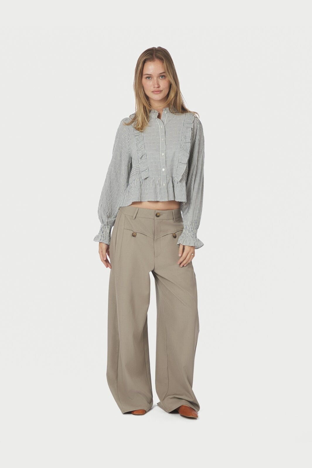 Gestreepte blouse van Neo Noir, gemaakt van 100% katoen. De blouse heeft verticale strepen in blauw, crème en wit met gerimpelde boorden.