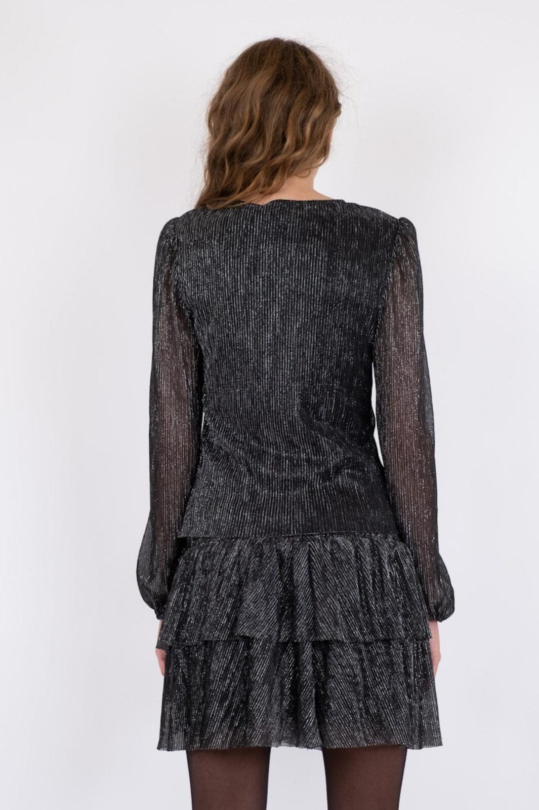 Zilveren blouse van Neo Noir met glanzend glittereffect en voering. Het heeft rimpeldetails aan de voorkant en lange mouwen met puffdetails bij de schouders.