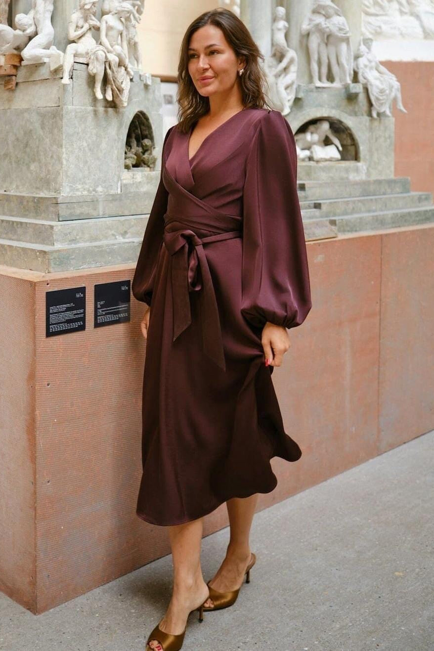 Satijnen jurk van Neo Noir in donkerroze. De jurk heeft een V-hals, lange mouwen met geplooide manchetten en een wikkelontwerp met een strikceintuur in de taille.
