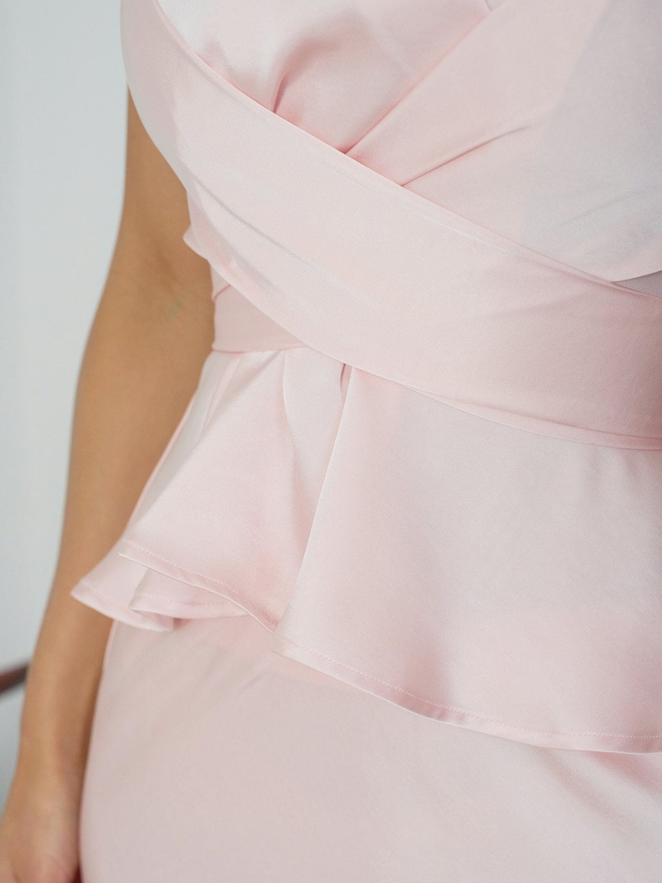 Roze satijnen top van Neo Noir. De top is mouwloos met een V-hals en een strikceintuur in de taille, wat zorgt voor een verstelbare pasvorm.