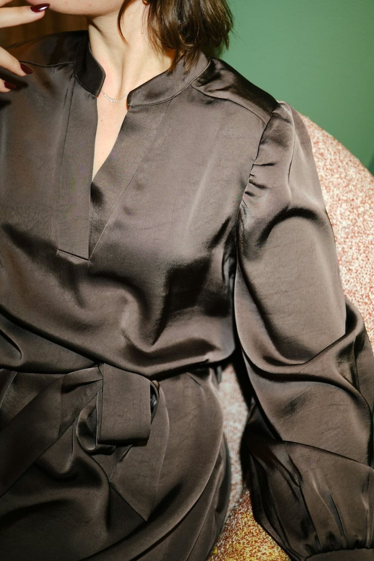 Donkerbruine satijnen jurk van Neo Noir met lange mouwen en manchetten. De jurk heeft een V-hals en een strikceintuur in de taille die je naar wens kunt aanpassen.