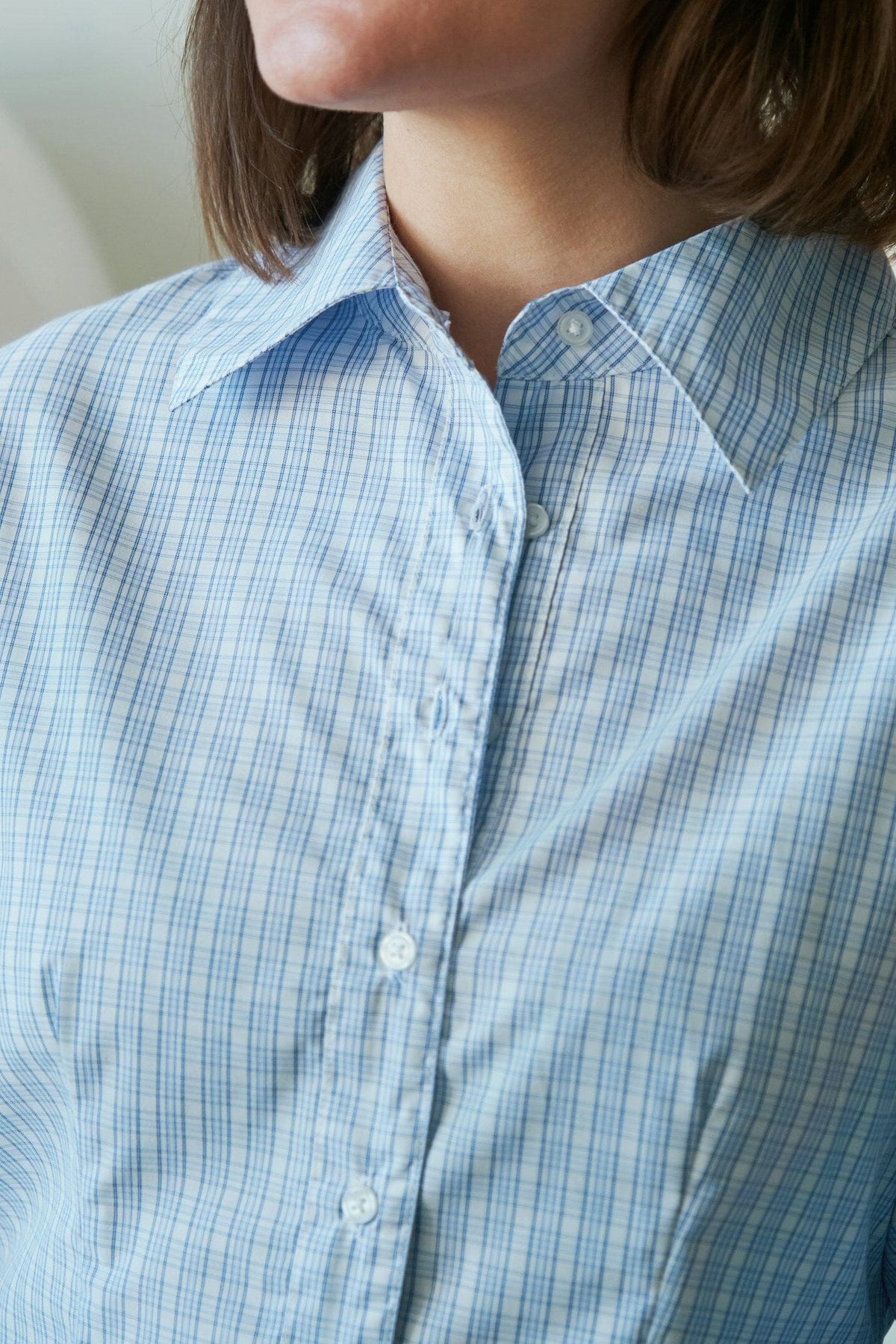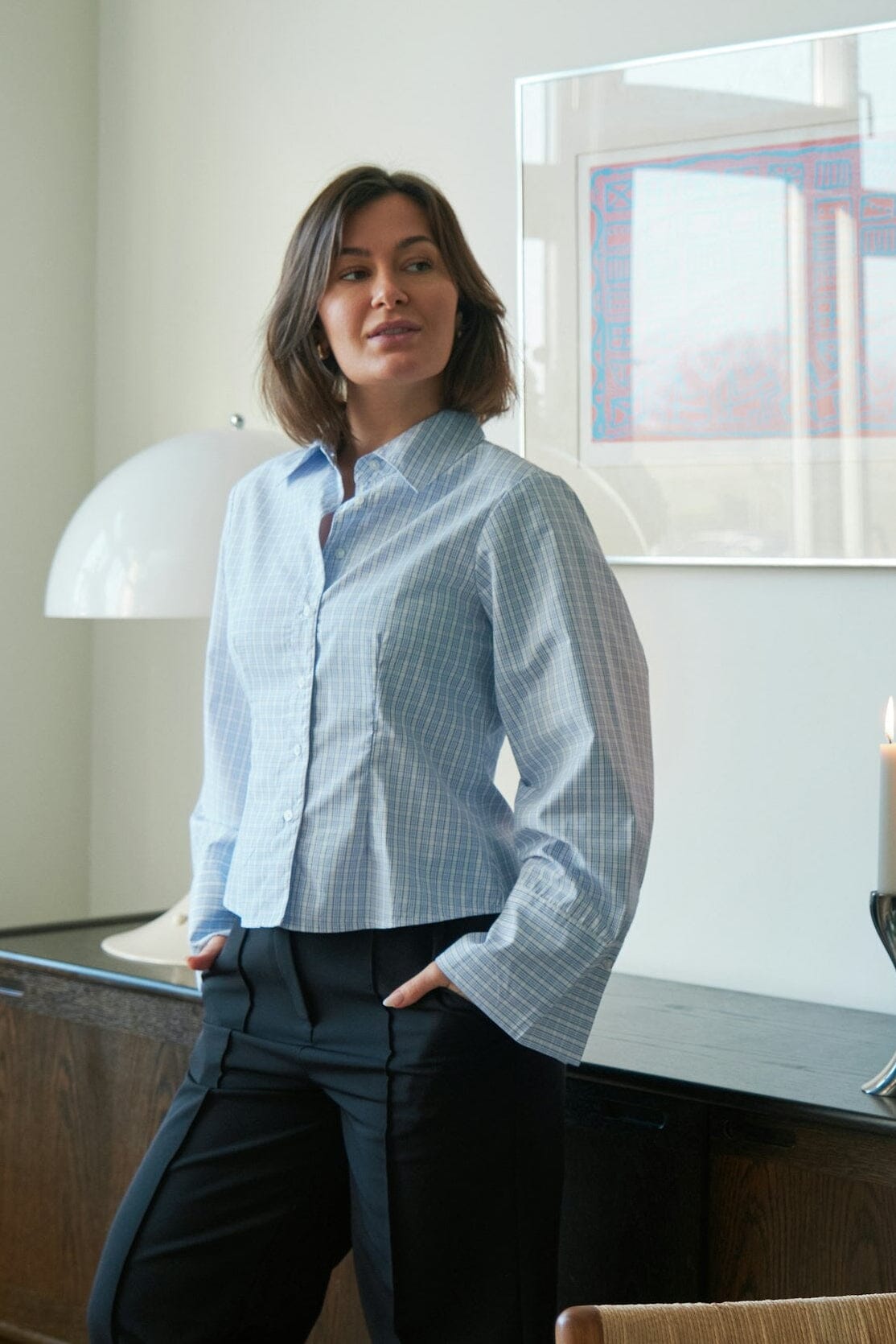 Lichtblauw geruite blouse van Neo Noir met een slim fit pasvorm. De blouse heeft een klassieke kraag en brede manchetten aan de lange mouwen. De knopen aan de voorkant maken het makkelijk om aan en uit te trekken.