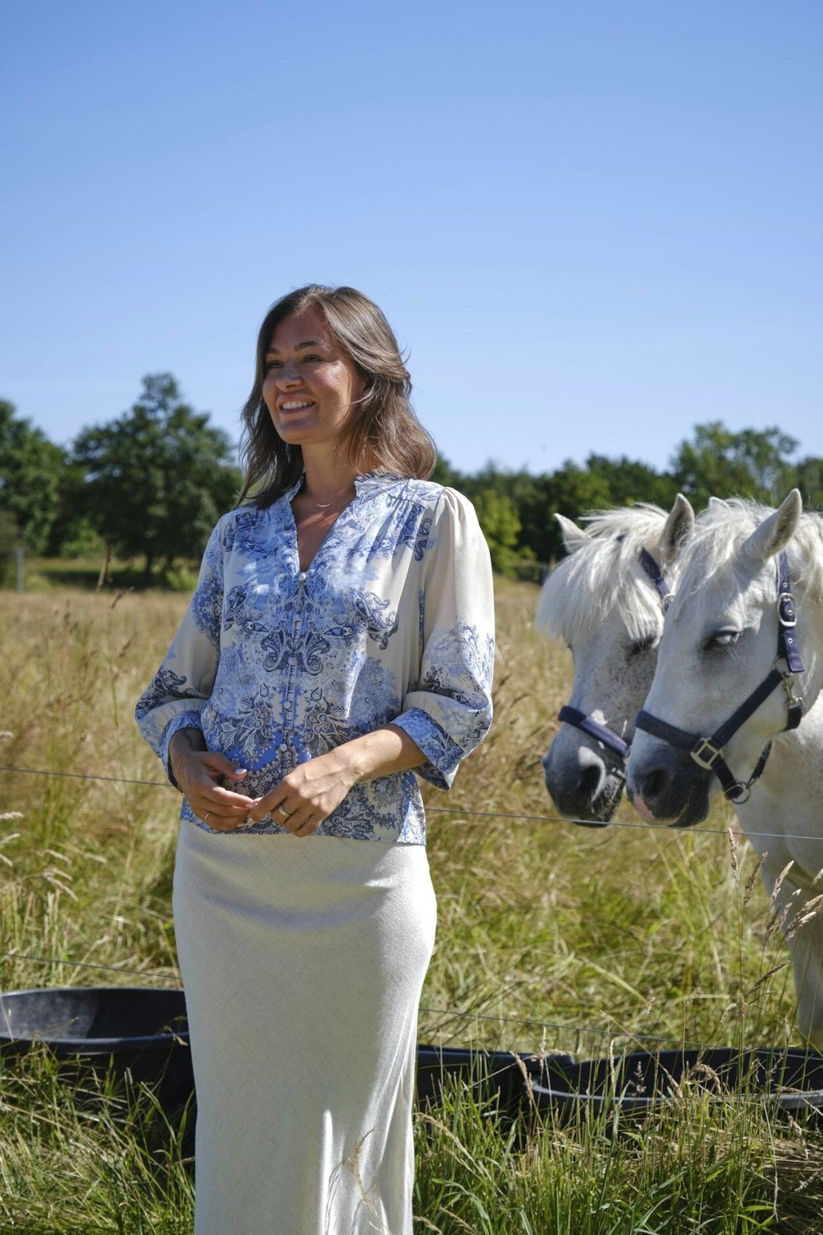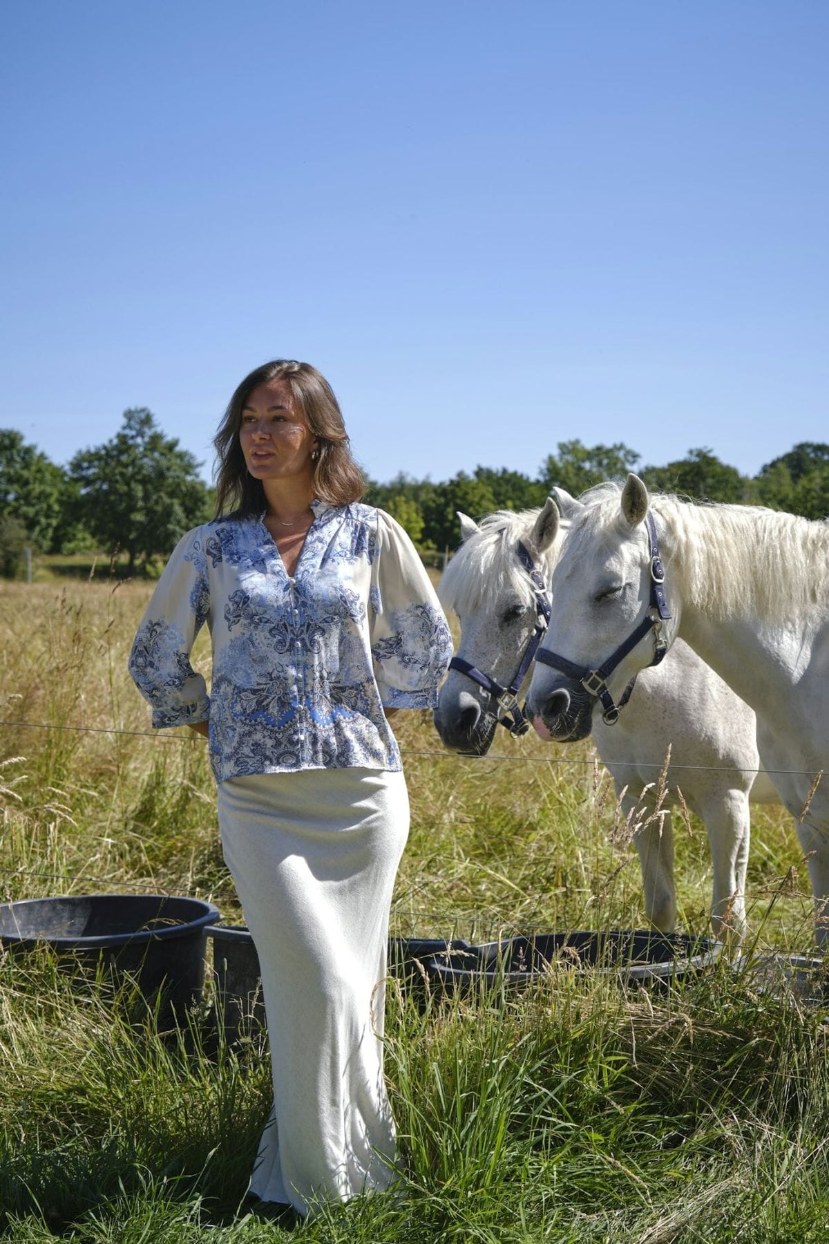 Vrouwelijke blouse met een prachtig paisley print. De blouse heeft 3/4 mouwen en loopt vooraan uit in een V-hals met decoratieve knopen. De pasvorm is losjes maar vrouwelijk.