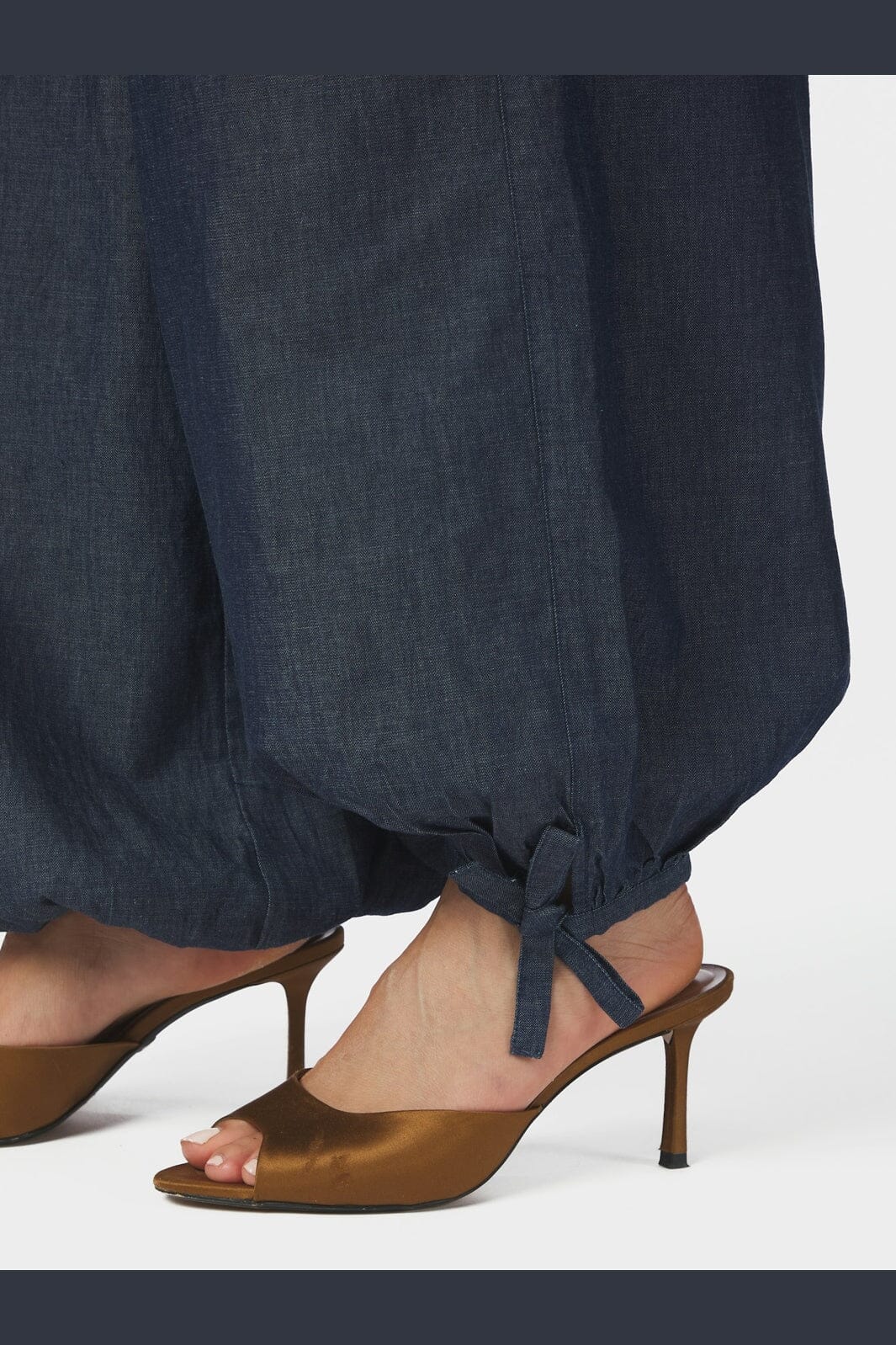 Blauwe denim broek van Neo Noir van 100% katoen. De broek heeft een ballon-silhouet met wijde pijpen die toelopen bij de enkels, en een hoge taille met elastiek en trekkoord.