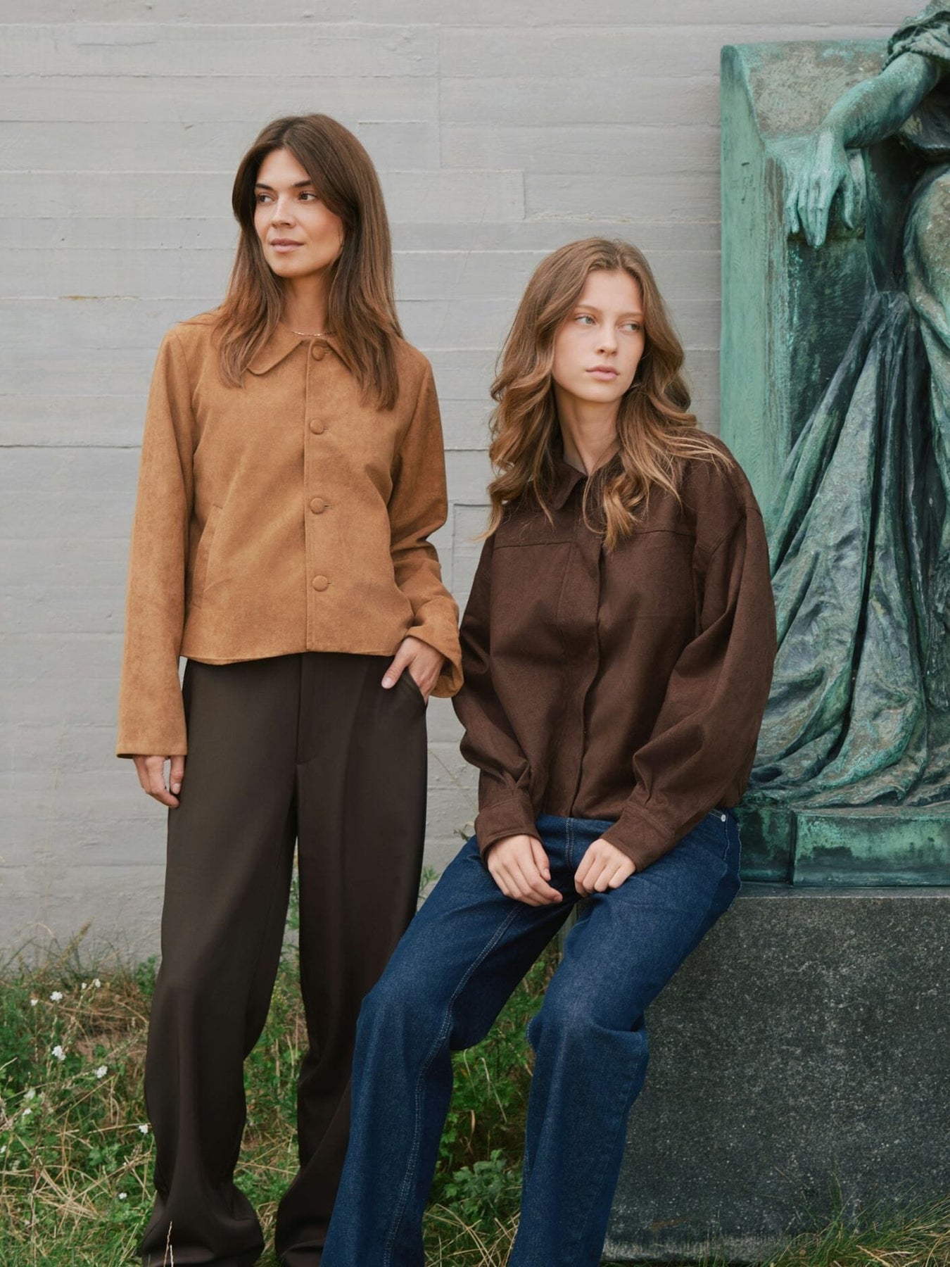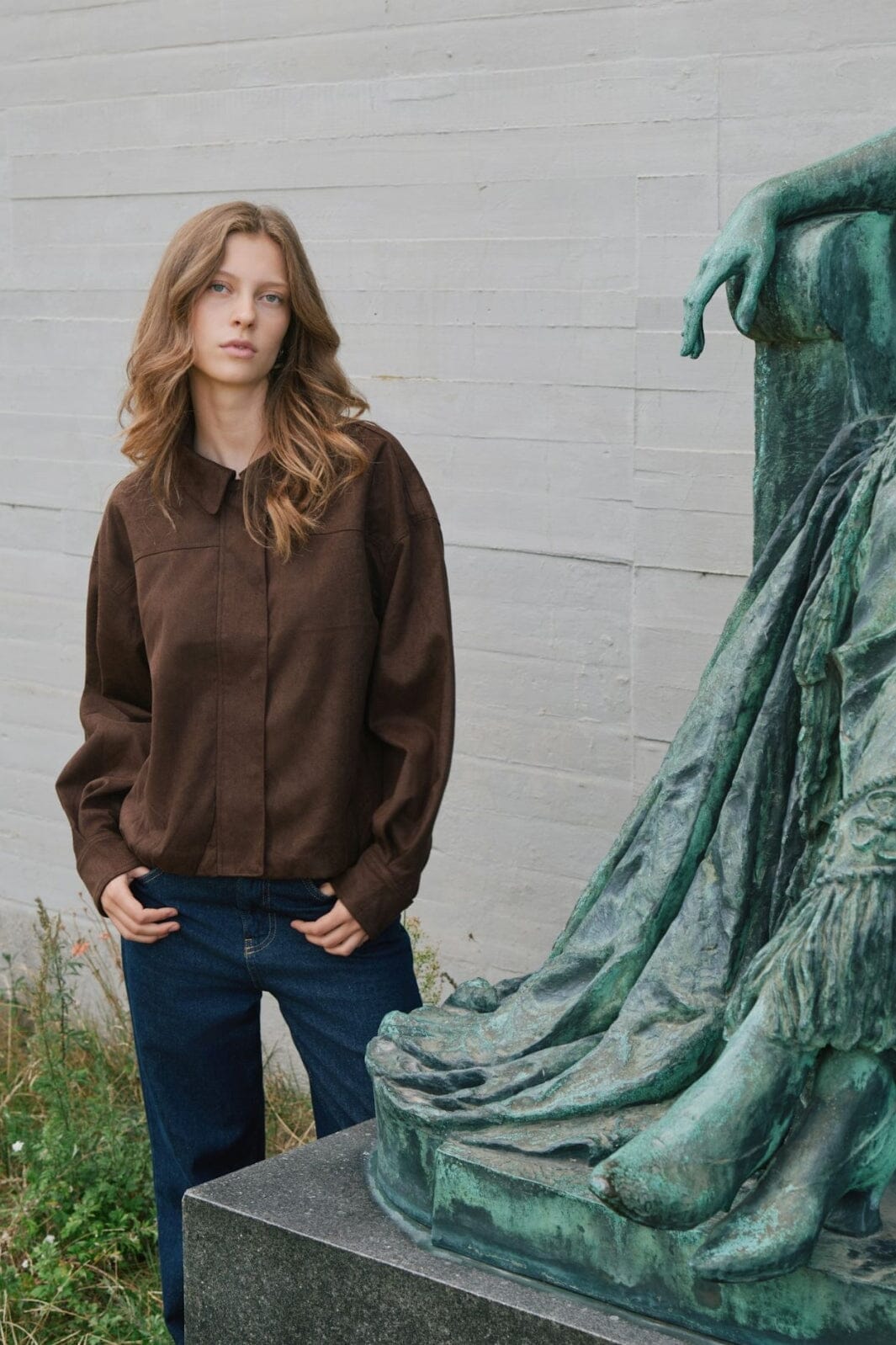 Donkerbruine jas van imitatie suède van Neo Noir. Hij heeft een oversized pasvorm met een overhemdkraag en een verborgen rits aan de voorkant. Het materiaal heeft een zachte afwerking met decoratieve stiksels.