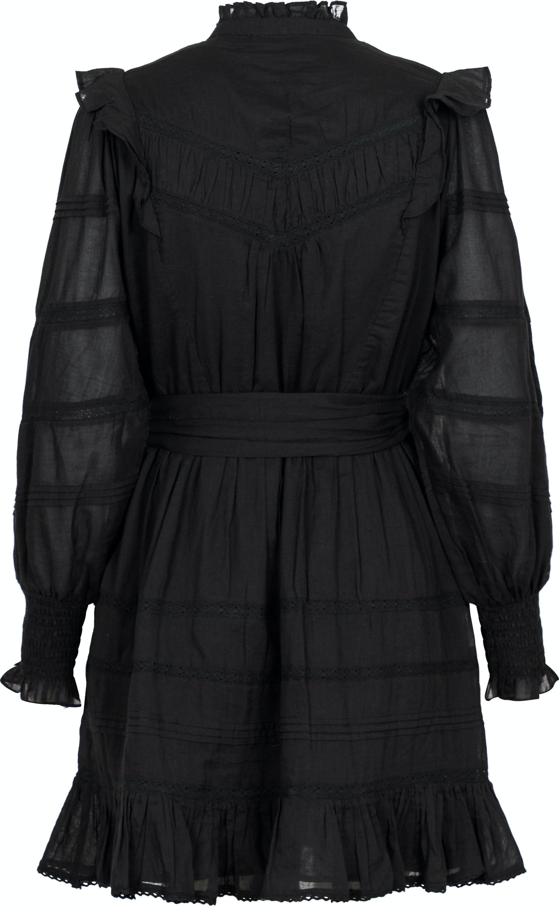 Zwarte voile jurk van Neo Noir in zachte katoen. De jurk heeft ruffle randen, knopen aan de voorkant en een strik in de taille. De lange mouwen hebben elastische manchetten.