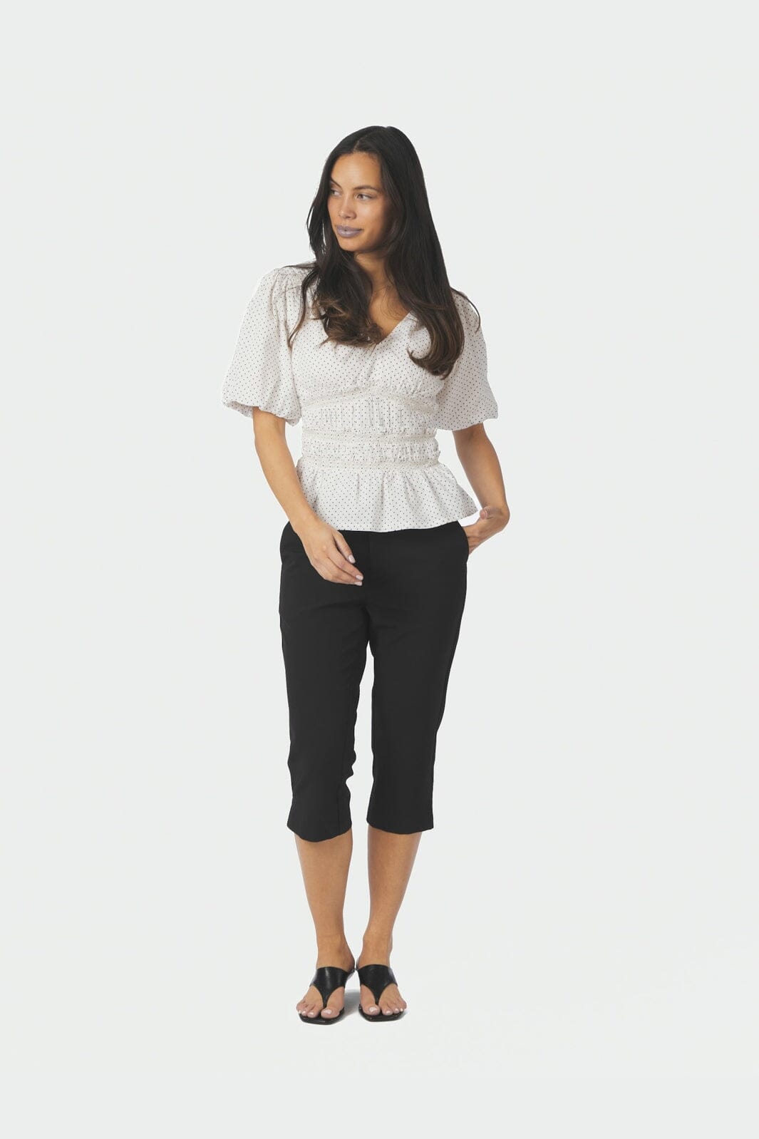 Witte blouse van Neo Noir met kleine zwarte stippen. De blouse heeft korte mouwen en een V-hals met smock in de taille.