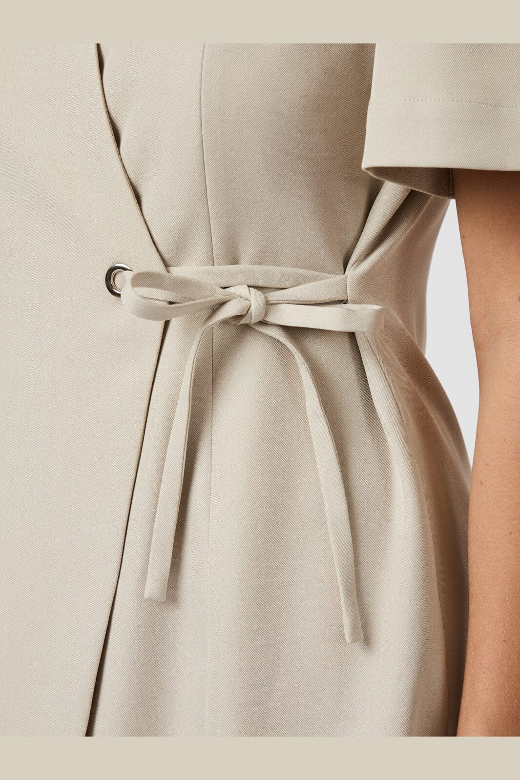 Zandkleurige jurk van Neo Noir met korte puffmouwen. De jurk heeft een figuurgetailleerde pasvorm met wikkelontwerp en een metalen ring met strikband in de taille.