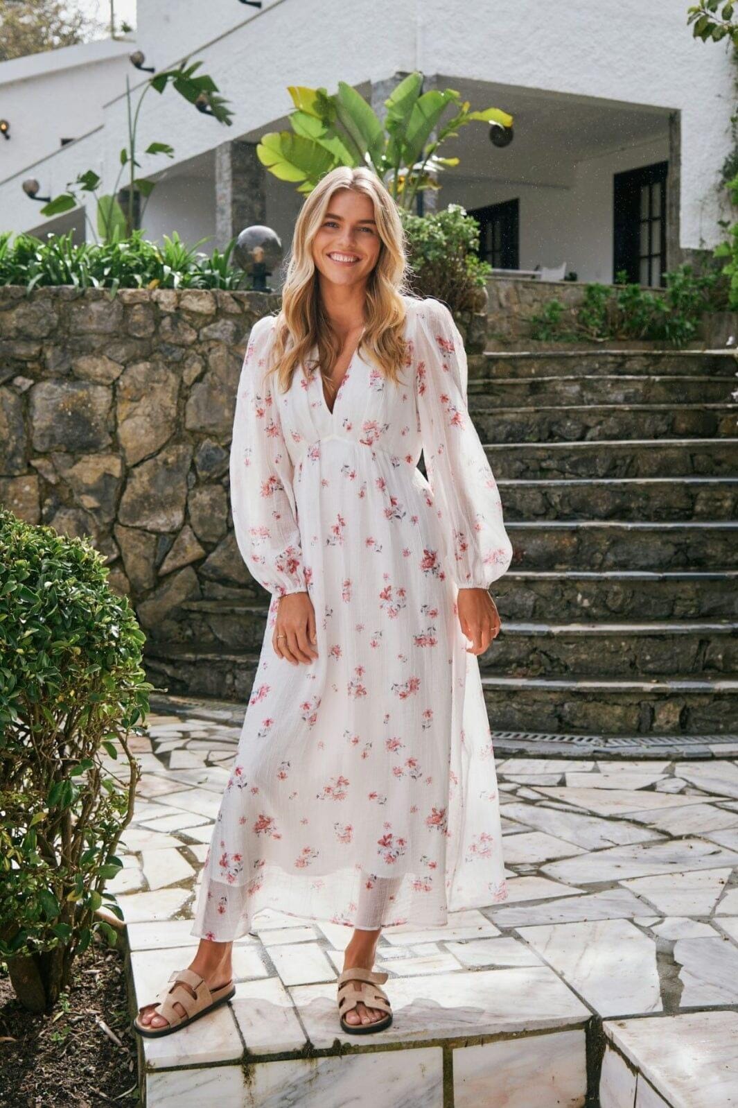 Enkellange jurk van Neo Noir in wit met roze en grijs bloemenprint. De jurk heeft pofmouwen, een V-hals en een semi-loose pasvorm die goede bewegingsvrijheid biedt.