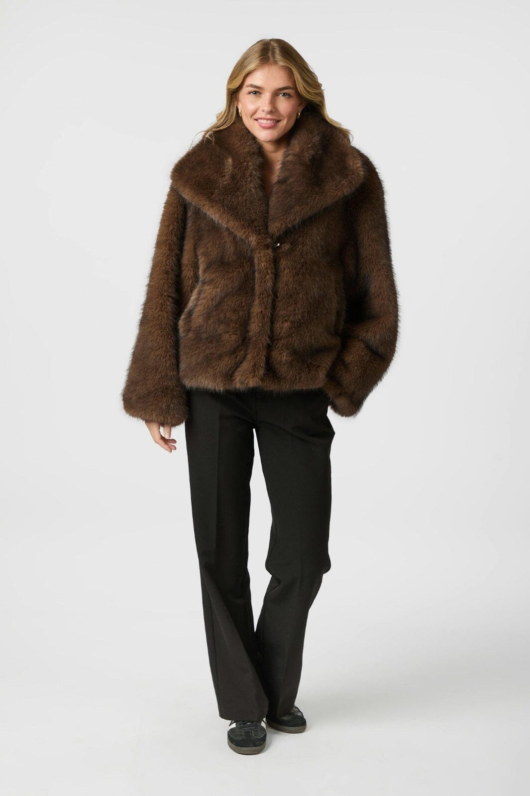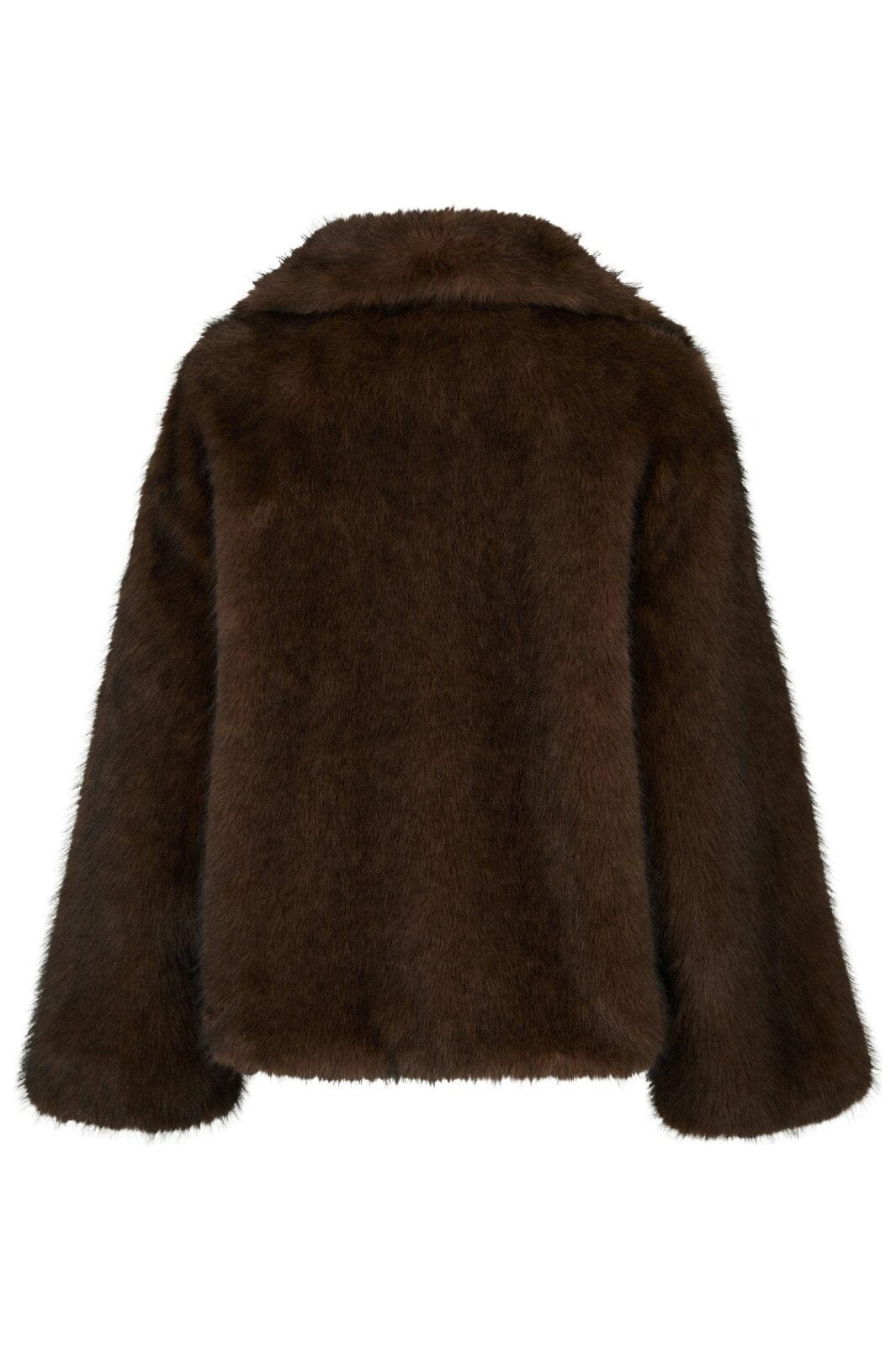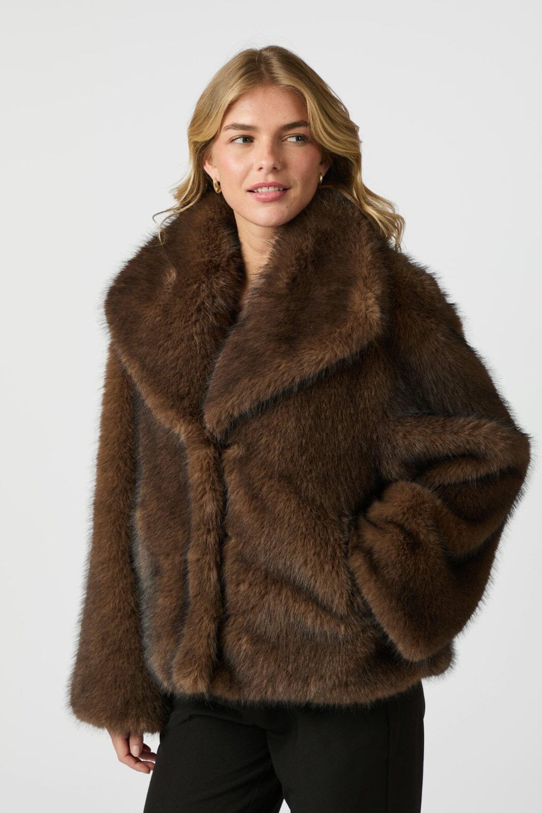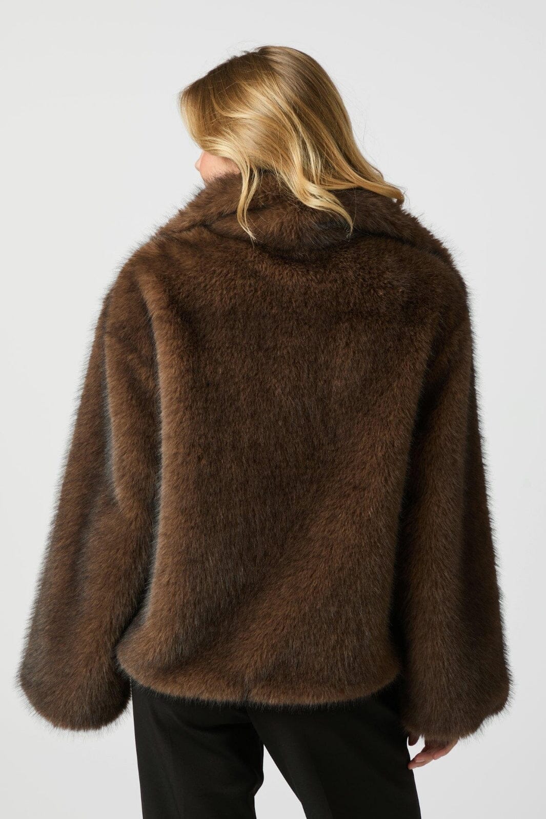 Superzachte en comfortabele imitatiebontjas in een losse en oversized pasvorm. Het model is 176 cm en draagt maat 36.
