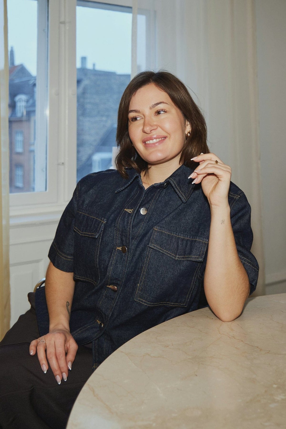 - Het model is 176 cm lang en draagt maat 36