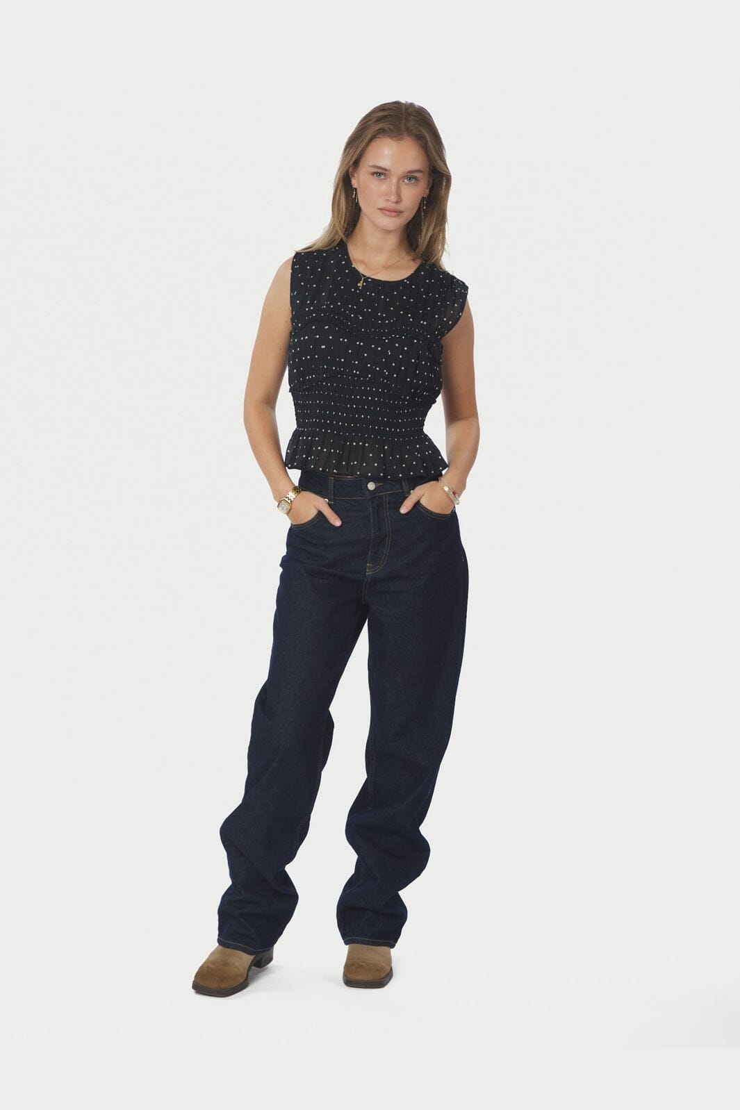 Zwart topje van Neo Noir, gemaakt van 100% katoen met witte stippen. De top heeft smokdetails en ruches.