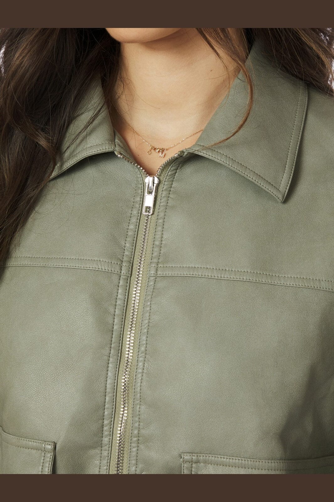 Faux leren jas van Neo Noir in een zachte groene tint. De jas heeft een oversized pasvorm met een overhemdkraag en een ritssluiting aan de voorkant. Twee grote zakken met klep aan de voorkant geven de jas een praktisch ontwerp.
