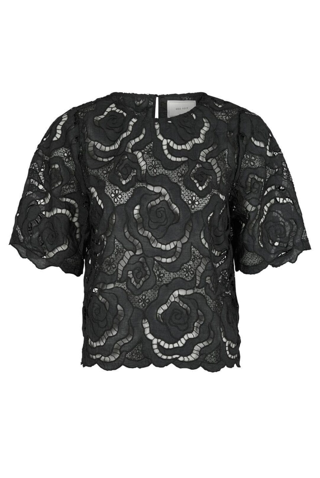 Zwarte kanten blouse van Neo Noir met bloemenpatroon. De blouse heeft een transparant effect door het kanten patroon en korte mouwen. De ronde hals en drukknoopsluiting maken het gemakkelijk om aan en uit te trekken.