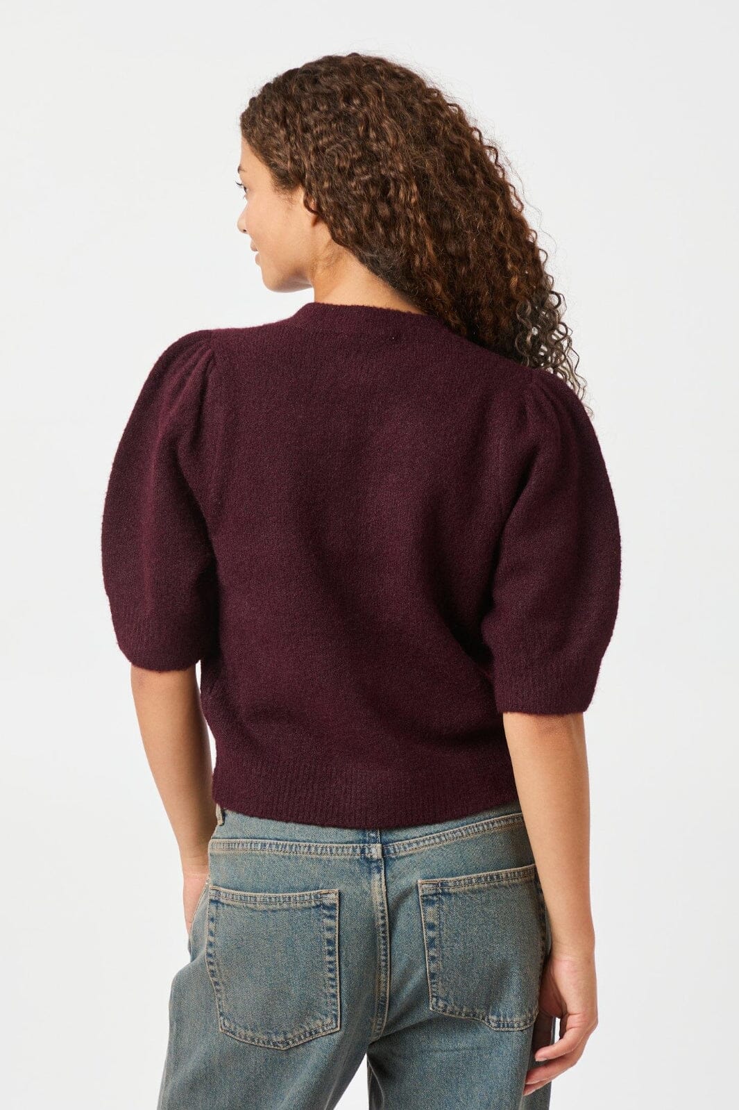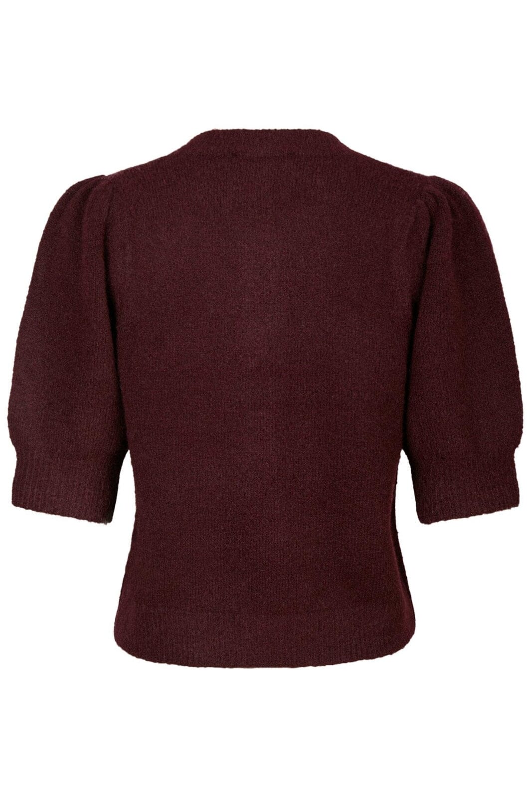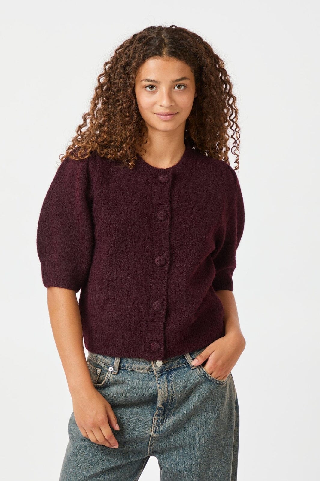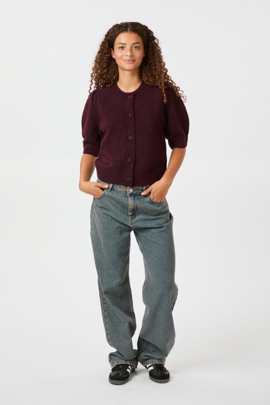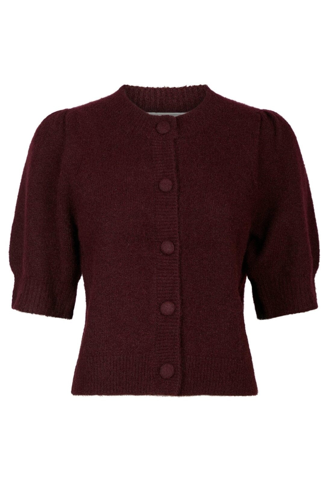 Wijnrode cardigan van Neo Noir met ronde halslijn. Het korte model heeft pofmouwen en een knoopsluiting aan de voorkant.