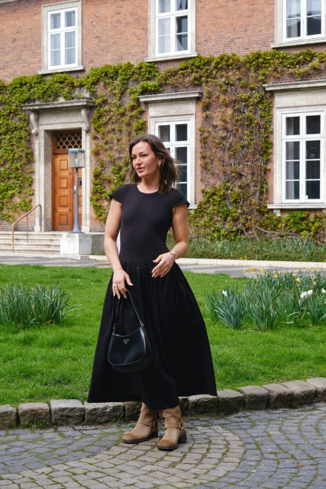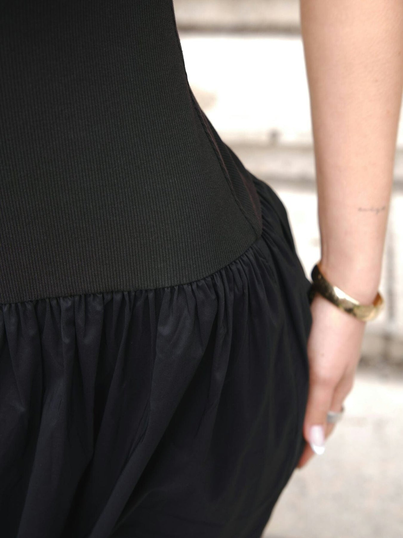 Zwarte jurk van Neo Noir met twee verschillende materialen. Het bovenstuk is van jersey met korte mouwen en een ronde hals, terwijl de rok van poplin is met ruchesdetails en een volle rok.