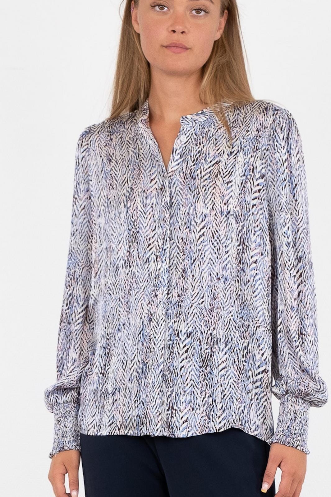Blouse van Neo Noir met een abstract patroon in blauwe, roze en zwarte tinten. De lange mouwen hebben puf en plooien bij de polsen, terwijl de losse pasvorm zorgt voor goede bewegingsvrijheid.