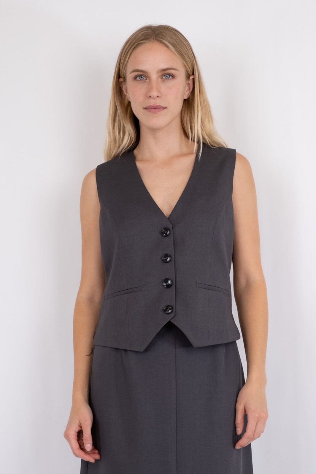 Donkergrijze vest van Neo Noir in licht gemêleerde suitkwaliteit. Het heeft een v-hals en vier knopen aan de voorkant. De vest is mouwloos en heeft een aansluitende pasvorm.