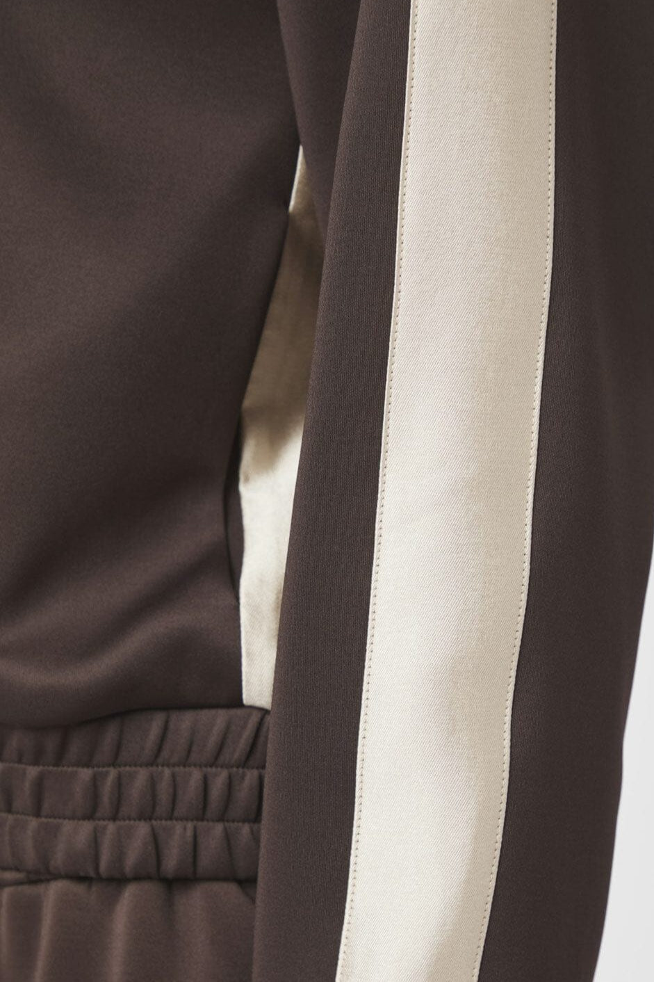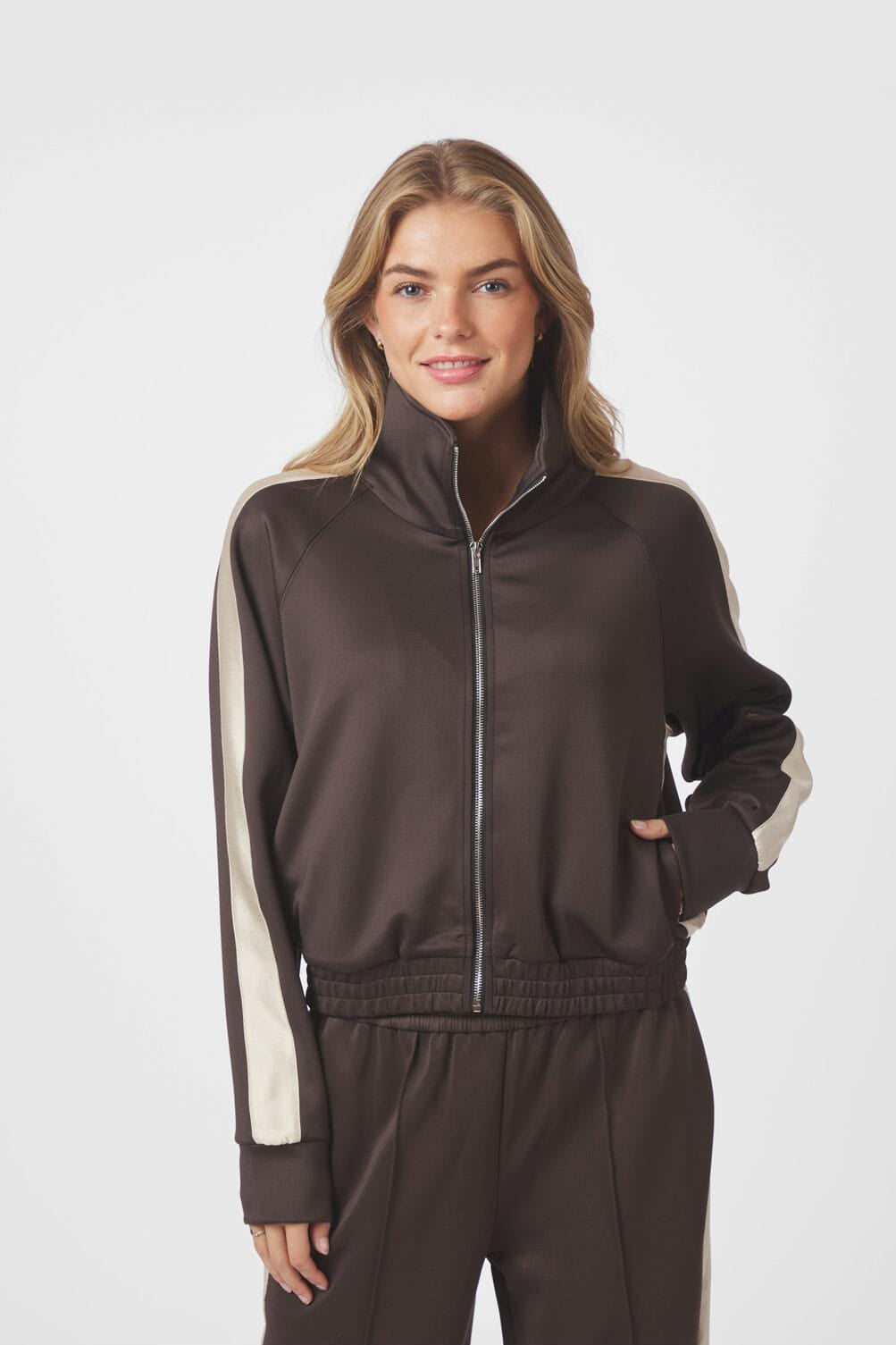 Coole trainingspak blouse met streepdetails langs de mouw en een rits. Het model is 176 cm en draagt maat 36.