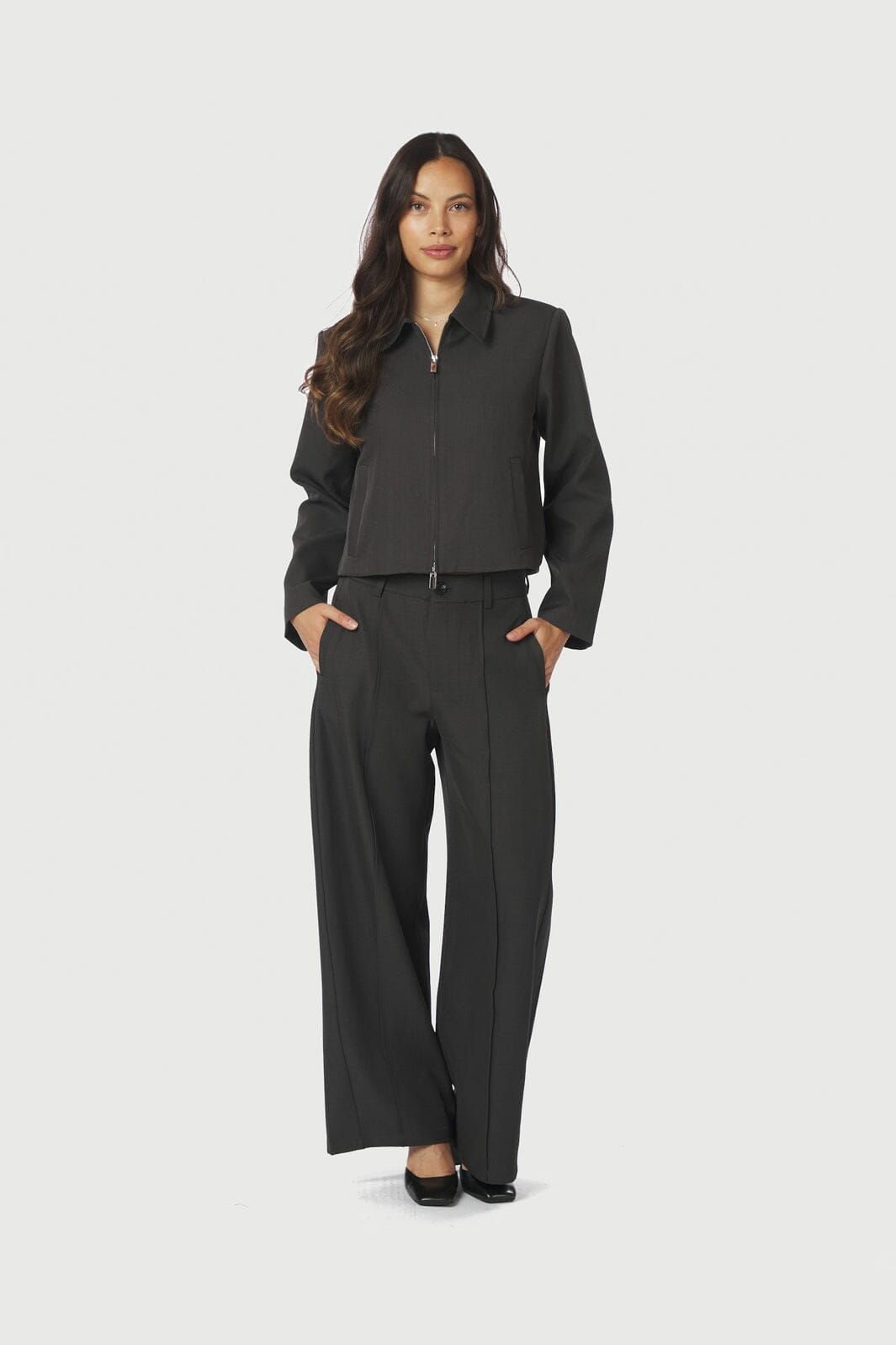 Donkergrijze jas van Neo Noir met een klassieke kraag en ritssluiting. De jas is gemaakt van een fijne pakstof, wat zorgt voor een strakke en eenvoudige uitstraling.