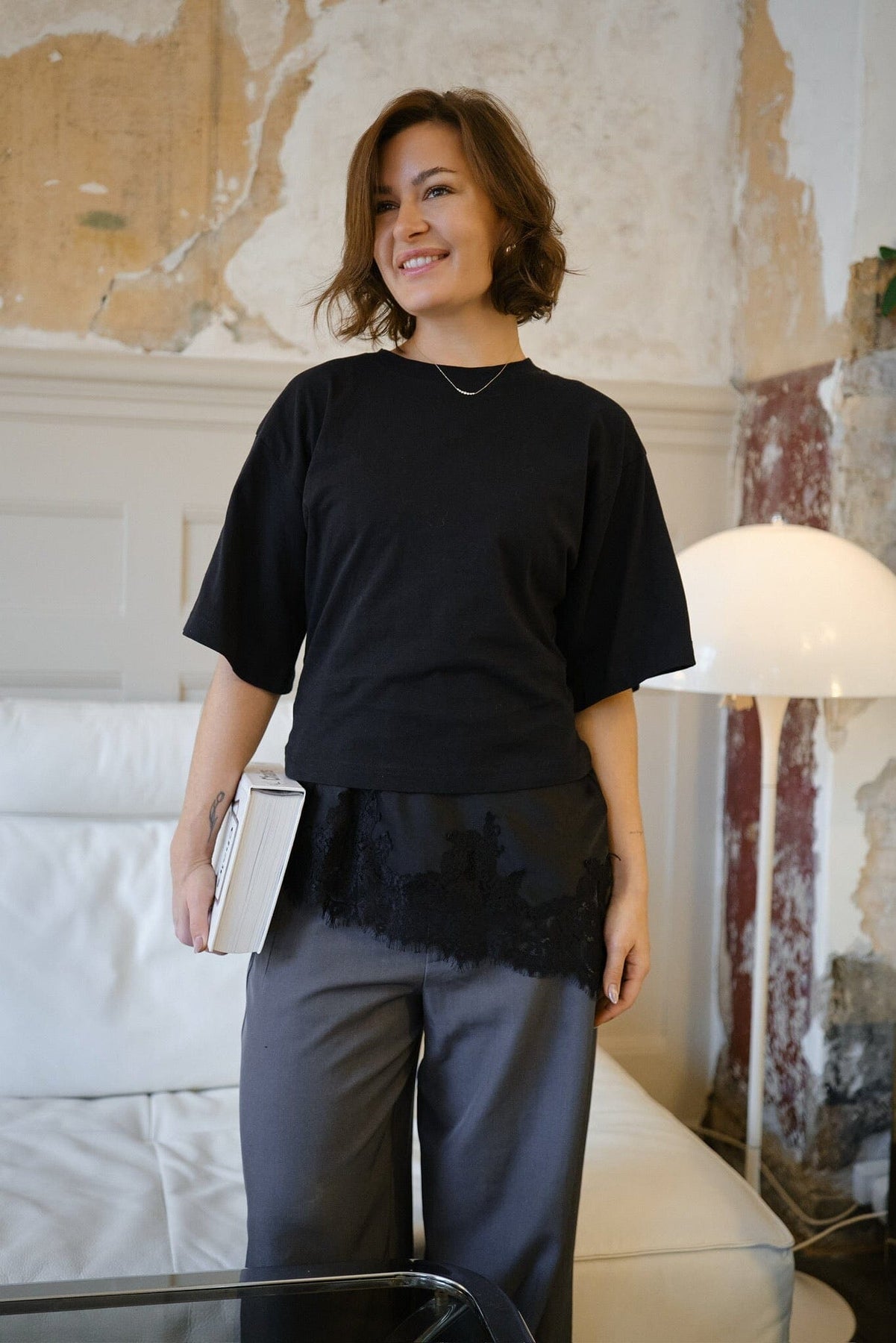 Zwarte kanten top van Neo Noir met dunne spaghetti-bandjes. De top heeft een V-hals en een asymmetrische rand met kanten details, wat een uniek snit geeft.