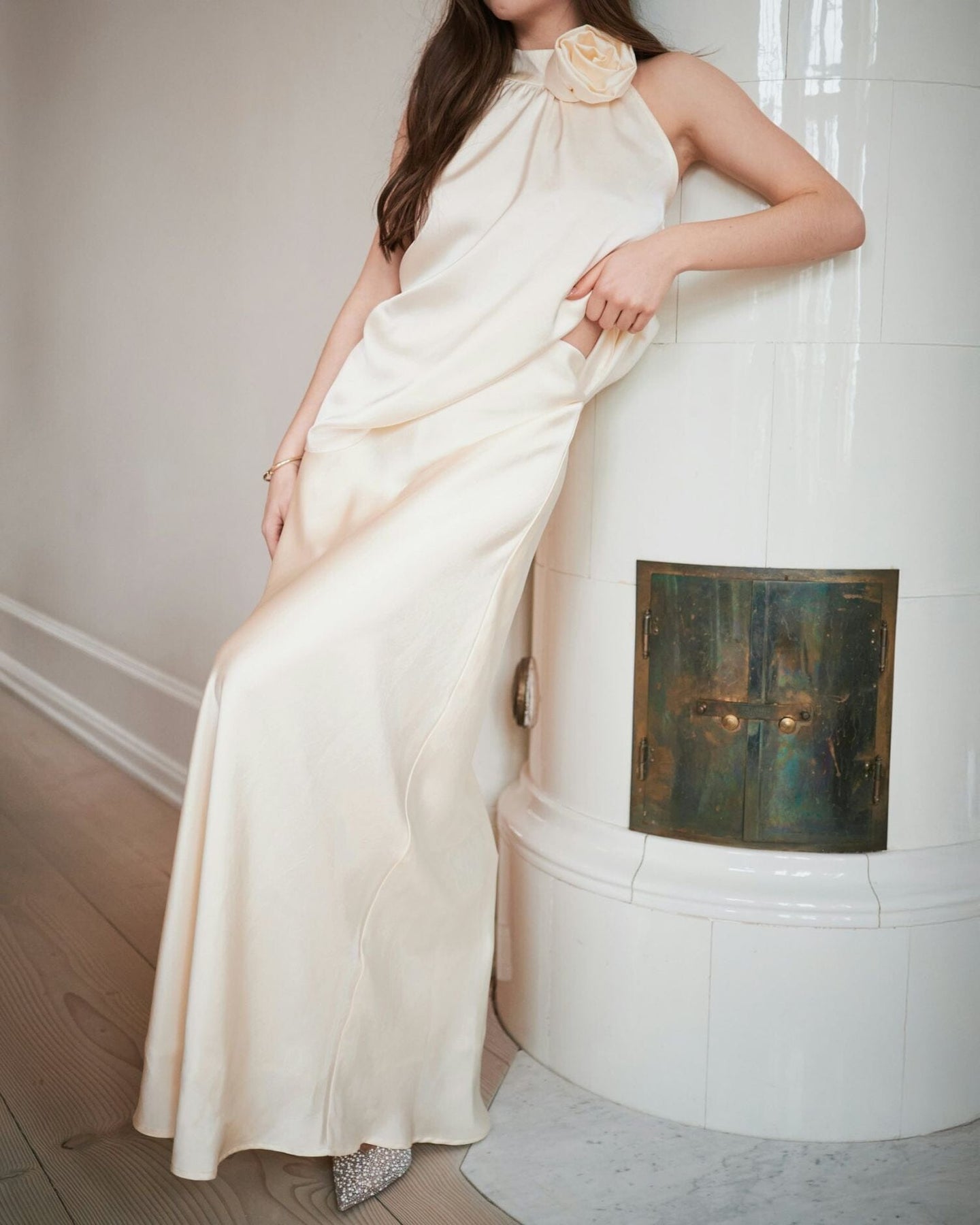 Lange rok van Neo Noir in parelgekleurde heavy sateen. De schuine snit en de aansluitende vorm geven de rok een karakteristieke uitstraling.