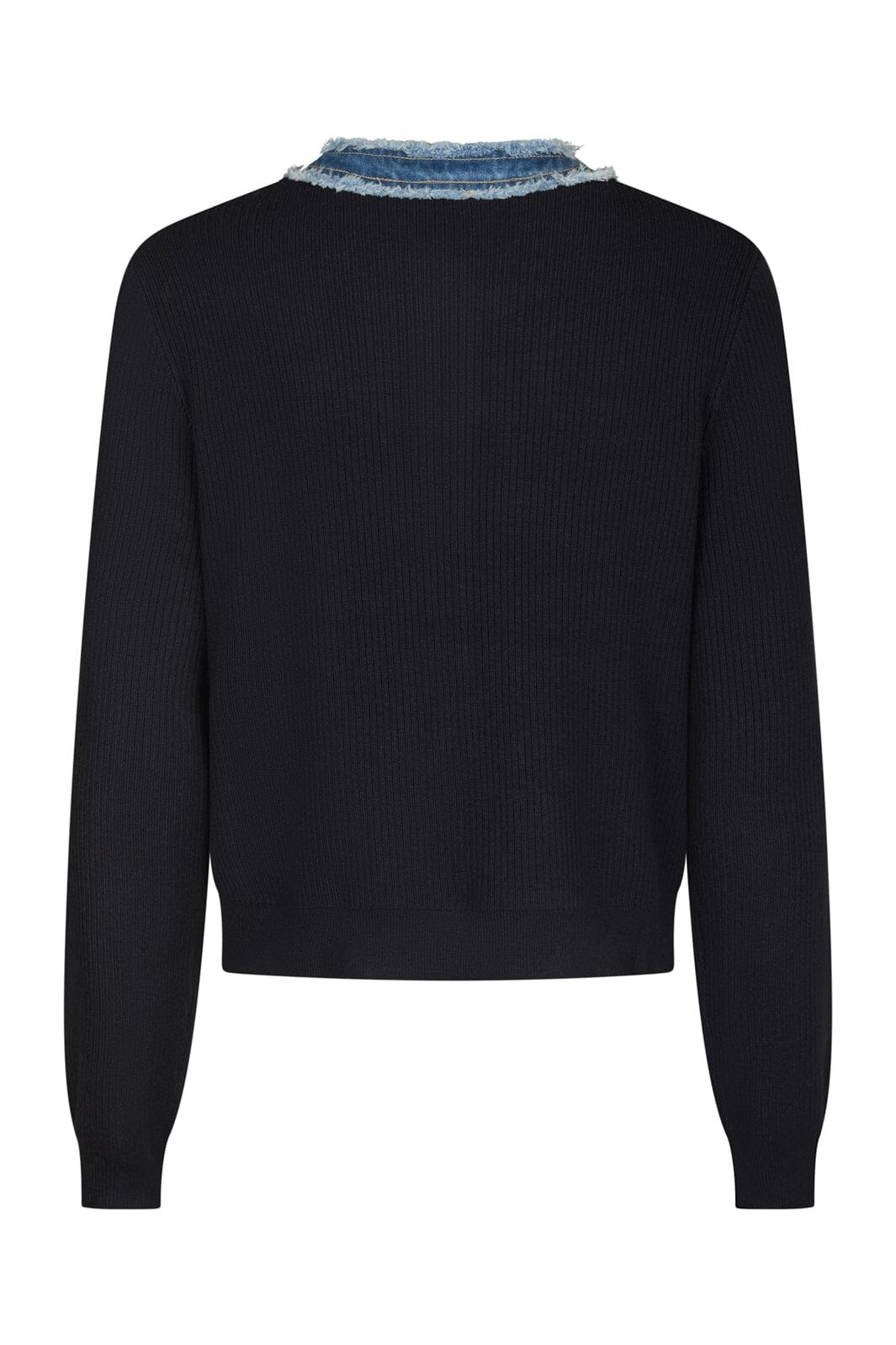 Donkerblauw gebreid vest van Neo Noir met denimranden bij de kraag en zakken. Het vest heeft knopen aan de voorkant en ruchesdetails die een zachte touch geven.