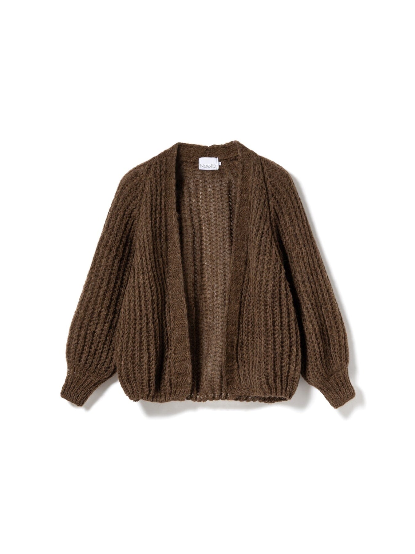 Bruine gebreide cardigan van Noella met open structuurpatroon. Het losse model heeft ballonvormige mouwen en een open voorkant zonder sluiting. Het is gebreid in een gemêleerde chocoladebruine tint.