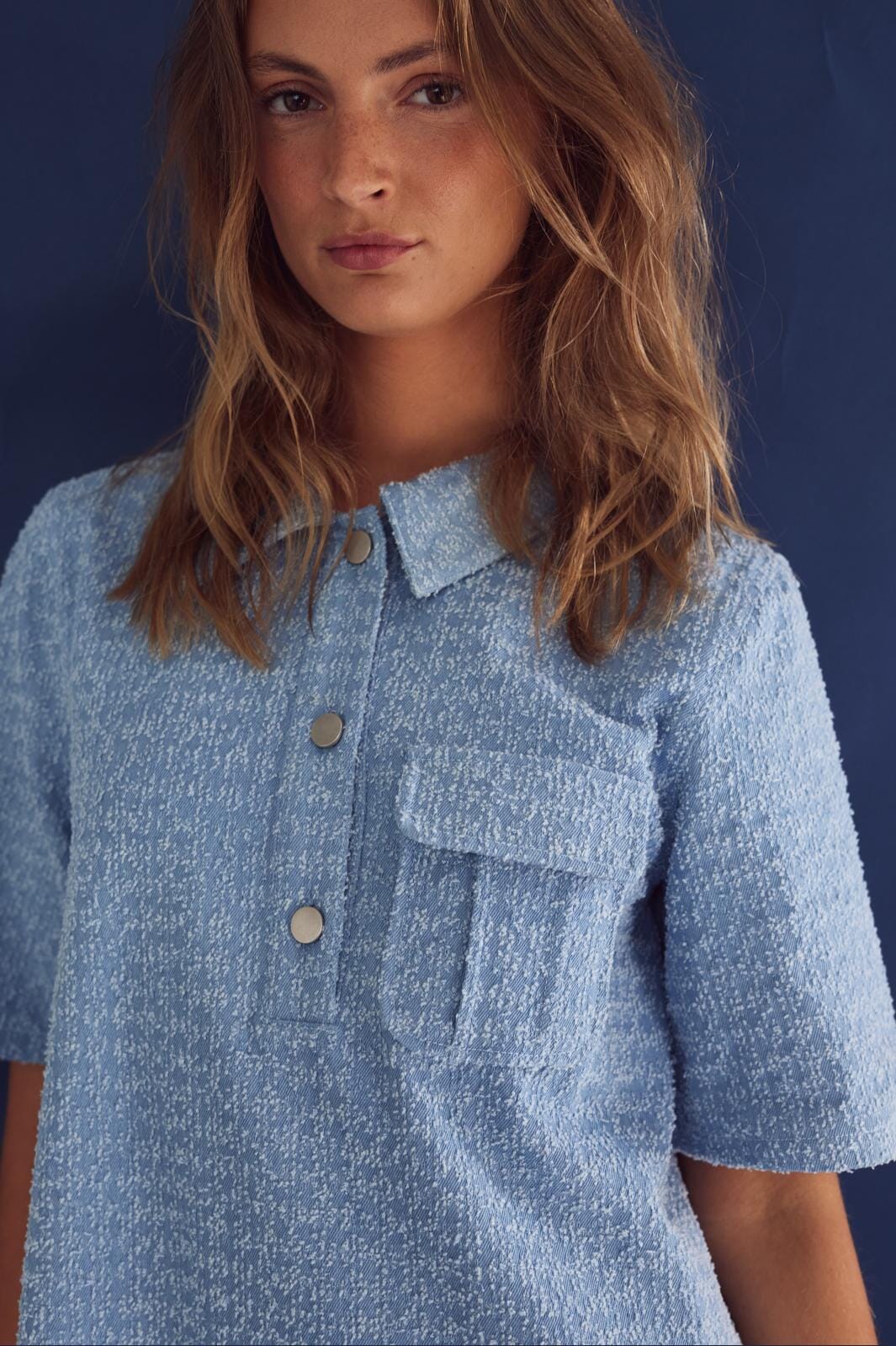 Denim jurk in lichtblau met A-lijn snit. De jurk heeft een overhemdkraag, knopen aan de voorkant en korte mouwen. De losse pasvorm biedt veel bewegingsvrijheid.