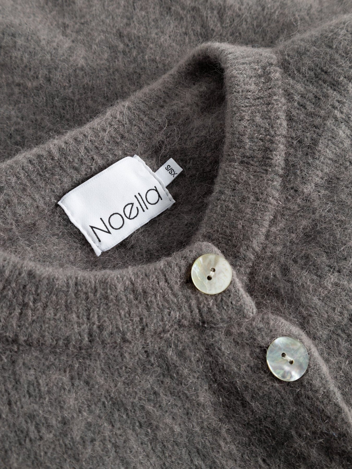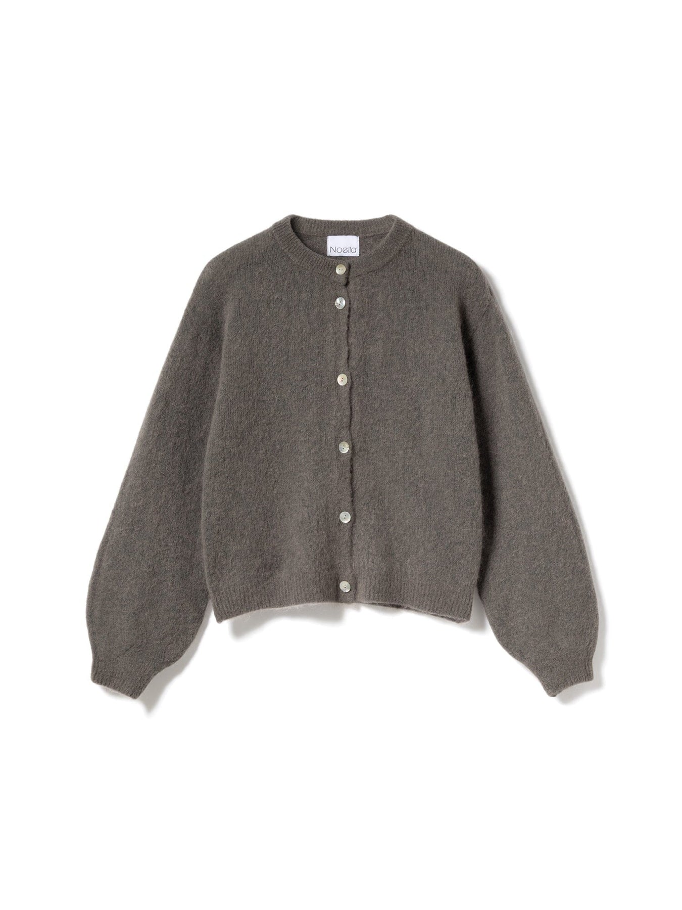 Gebreide cardigan van Noella in koffiebruin. Hij heeft een ronde hals, knopen aan de voorkant en brede mouwen met een lichte puff. Het materiaal is zacht en fluffy met een warme uitstraling.