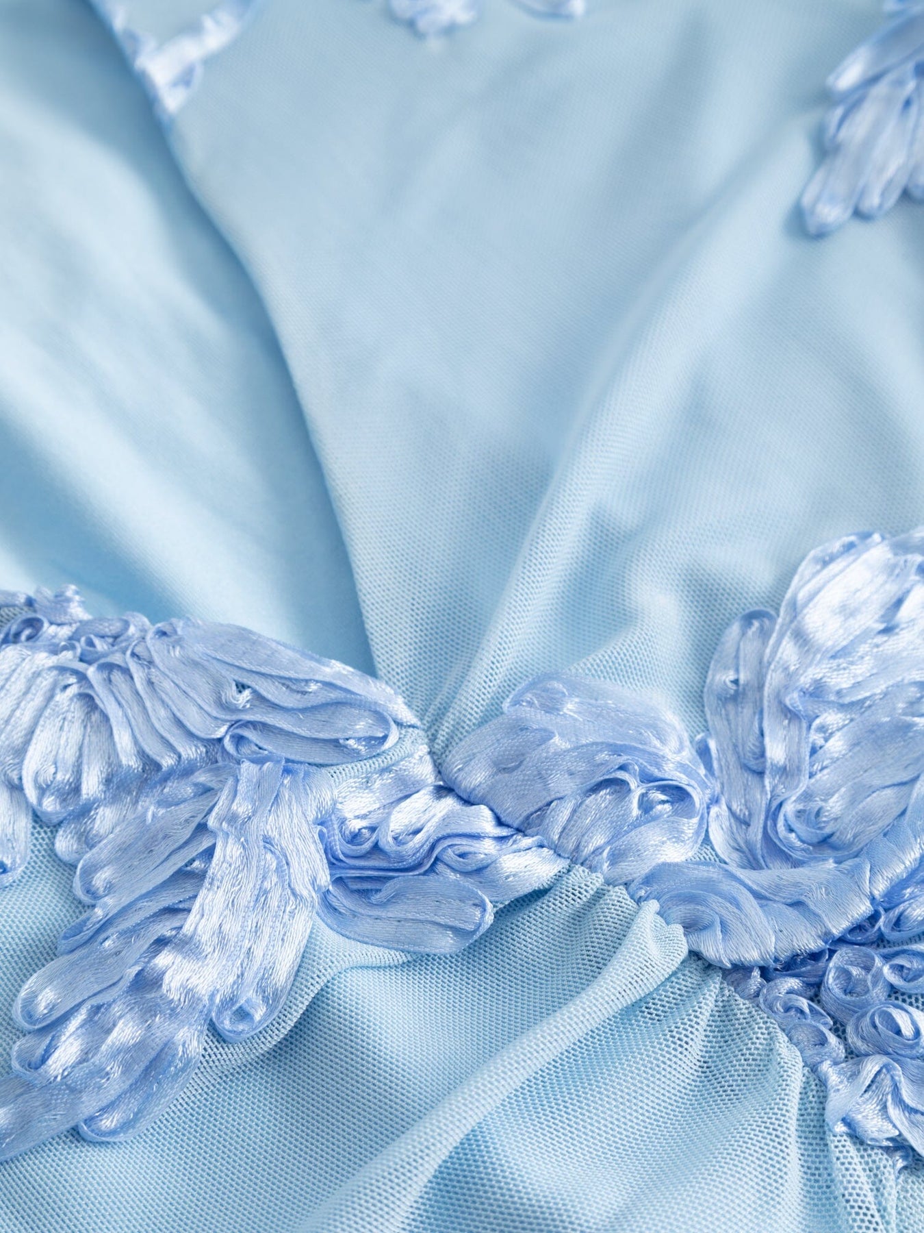 Lange jurk van Noella in lichtblauw met geborduurde bloemen. De jurk heeft een V-hals, lange mouwen en een split in het been met bloemenapplicaties.