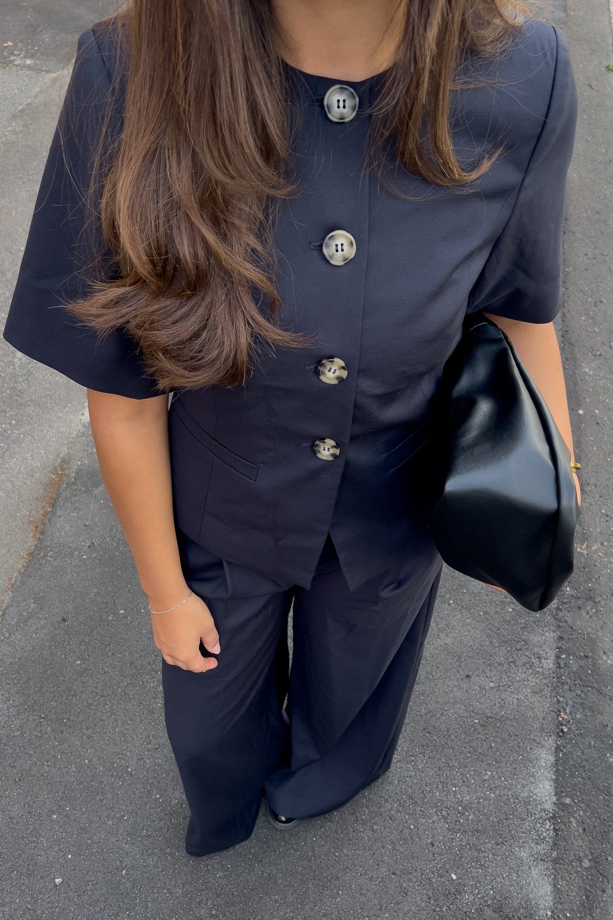 Zwarte blazer van Noella met korte mouwen en ronde halslijn. Grote knopen sieren de voorkant, en twee zijzakken geven de blazer een praktisch ontwerp.