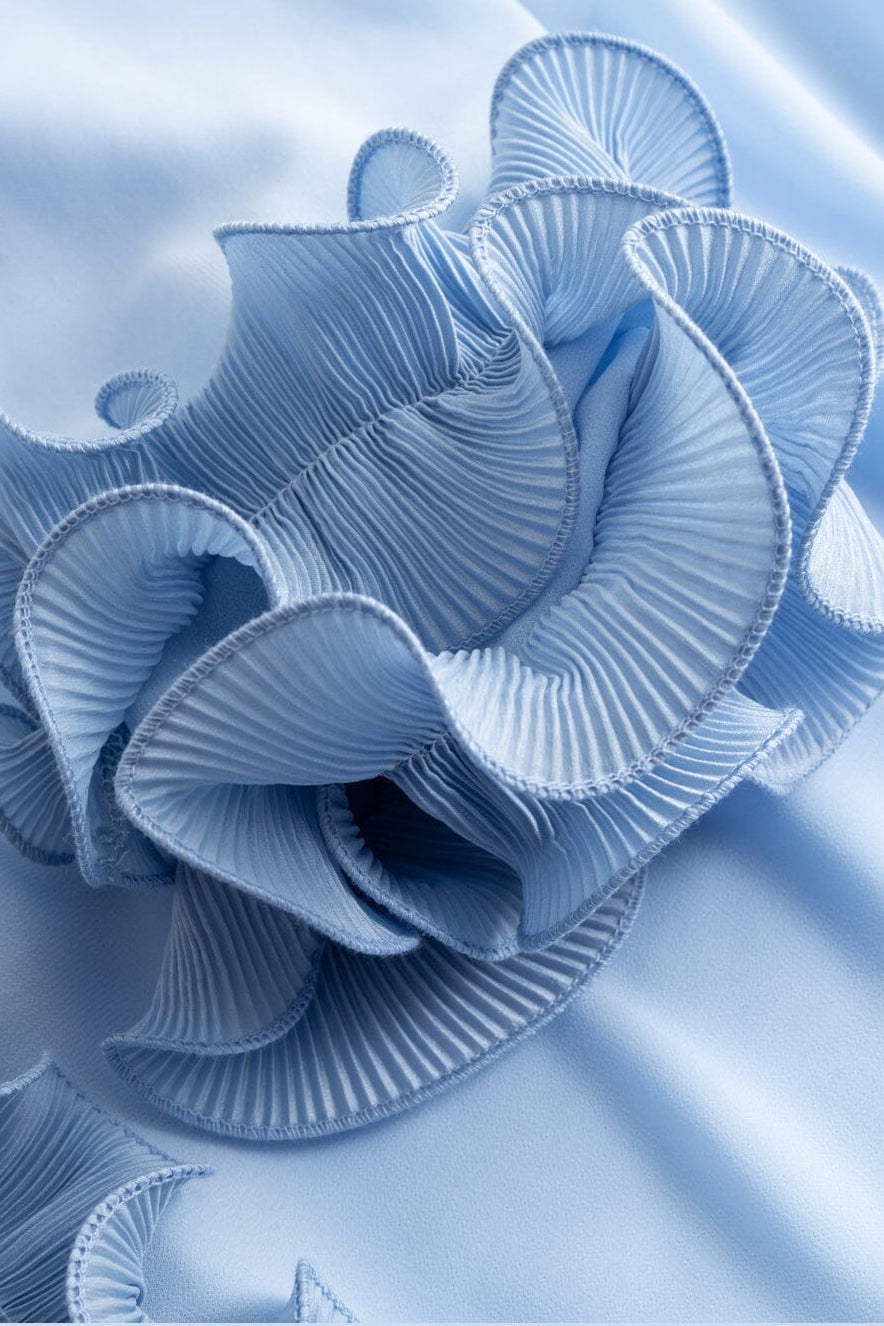 Lichtblau jurkje van Noella met ruches bij de mouwen en aan de onderkant. De jurk heeft een hoge halslijn met strikdetail en een strik in de nek.