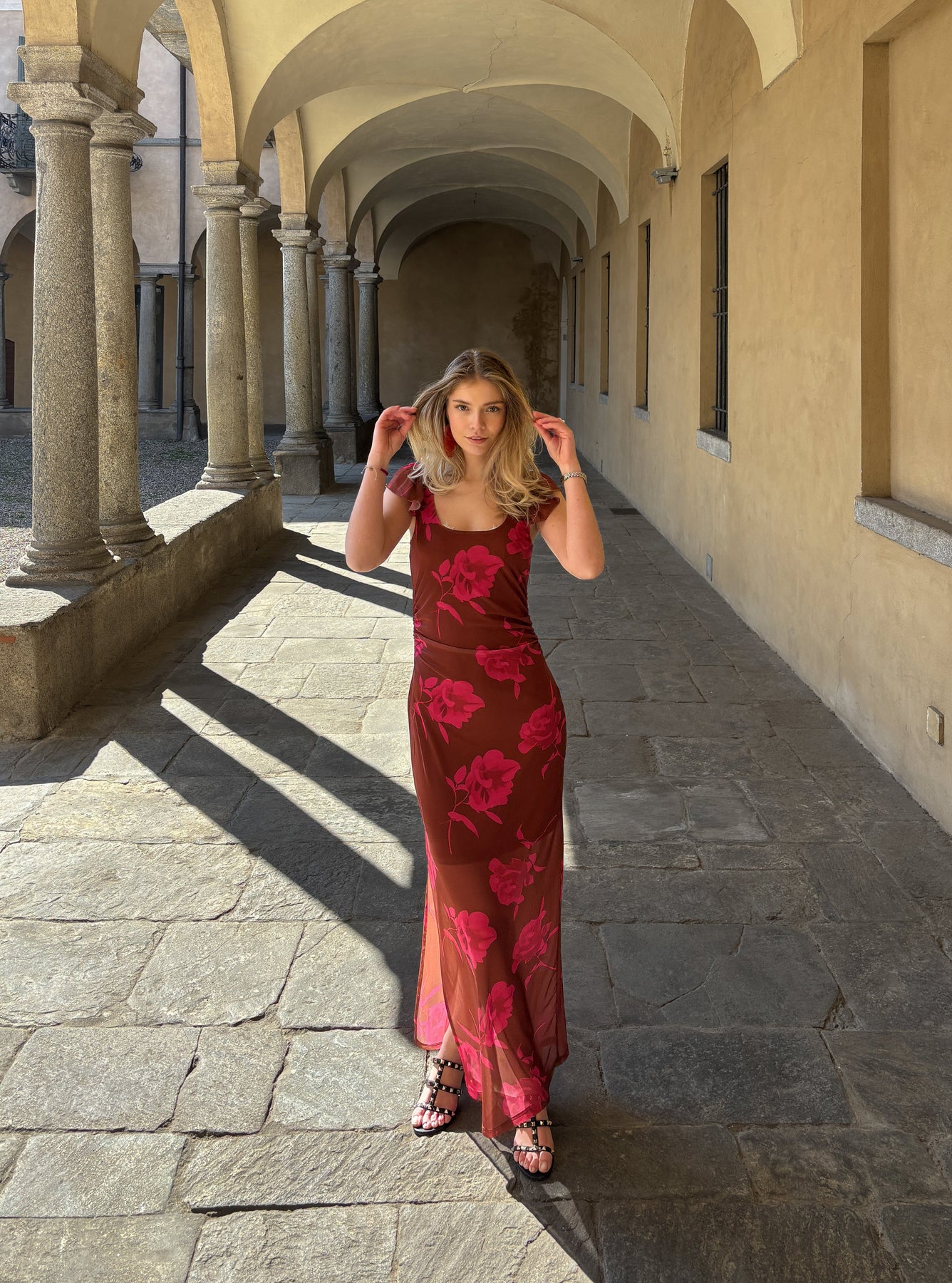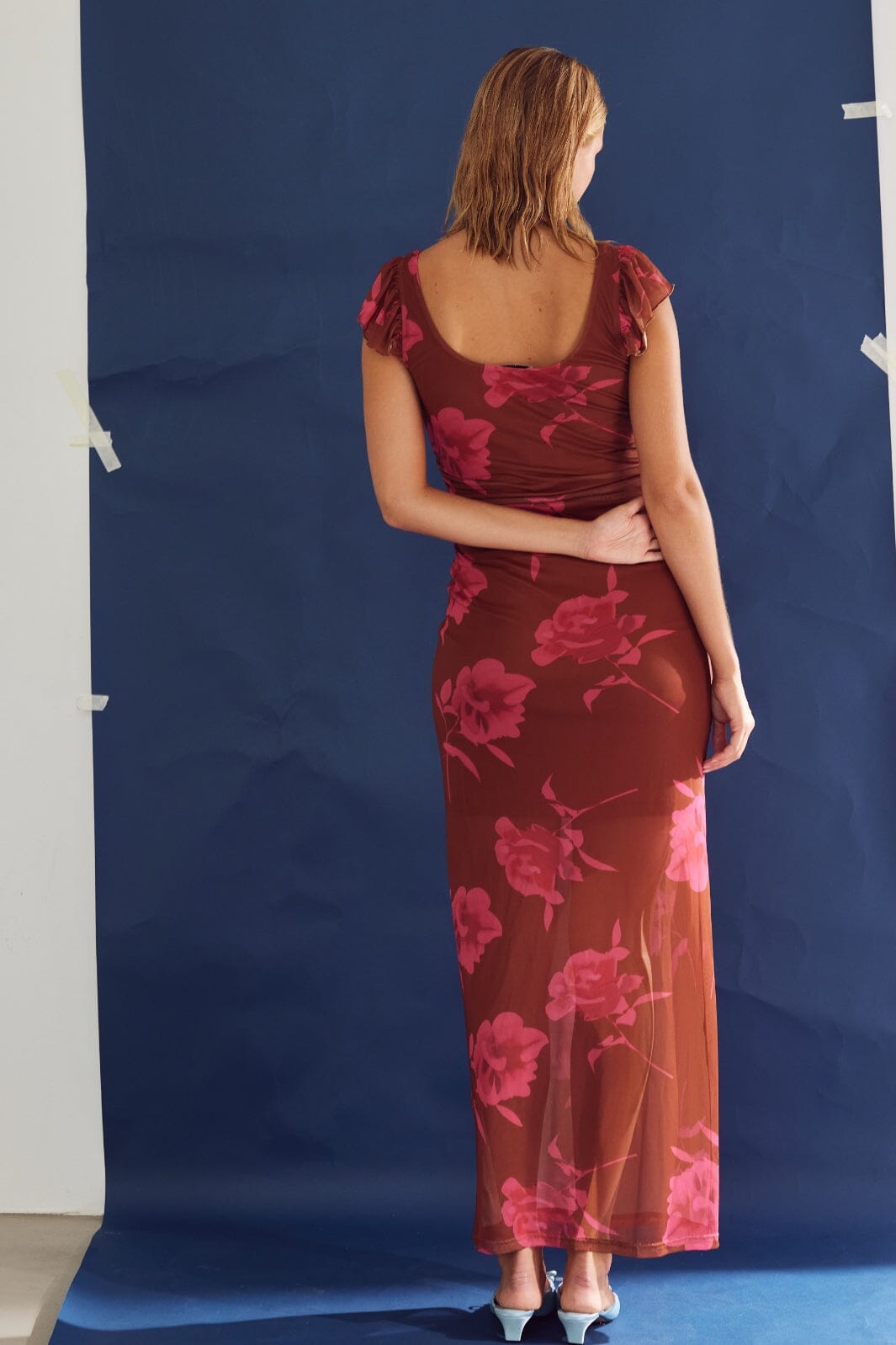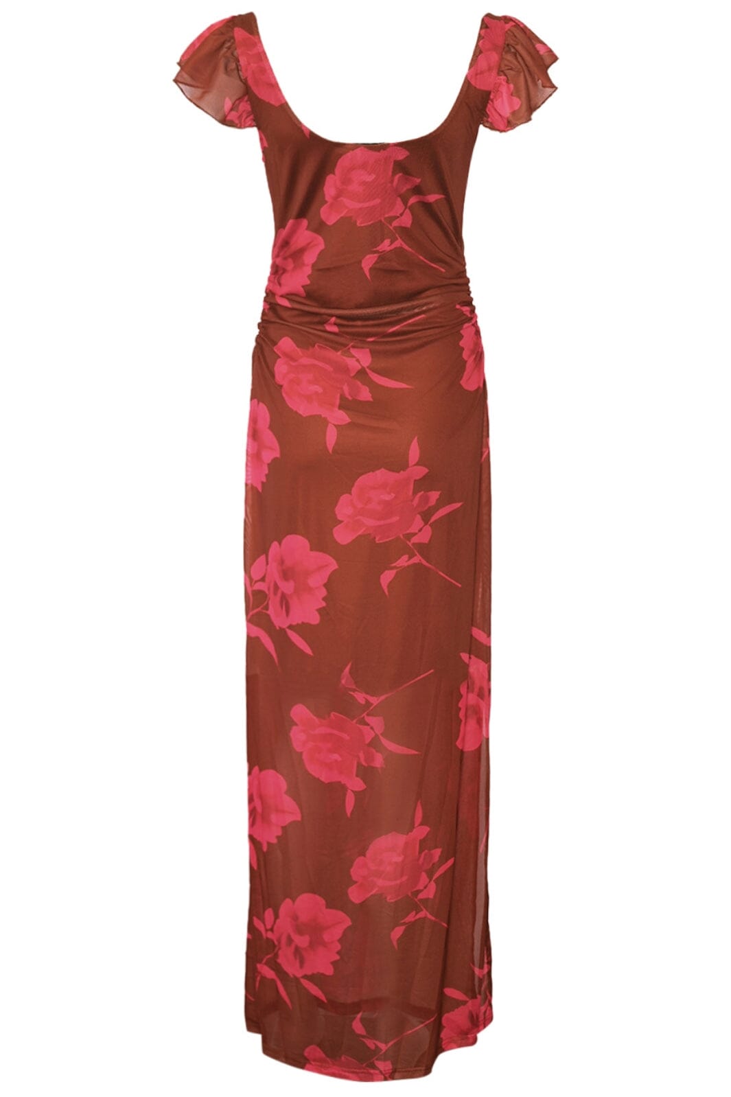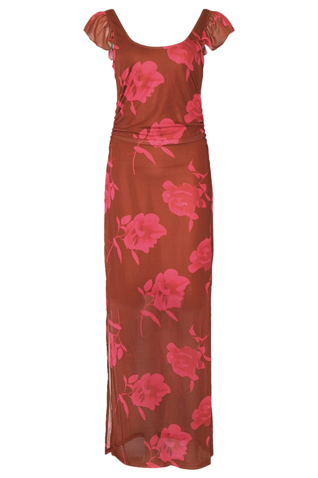 Lange jurk van Noella met roze bloemenprint op een bruine achtergrond. Het aansluitende model heeft korte mouwen met ruches en een ronde halslijn. Een split aan de zijkant biedt veel bewegingsvrijheid.