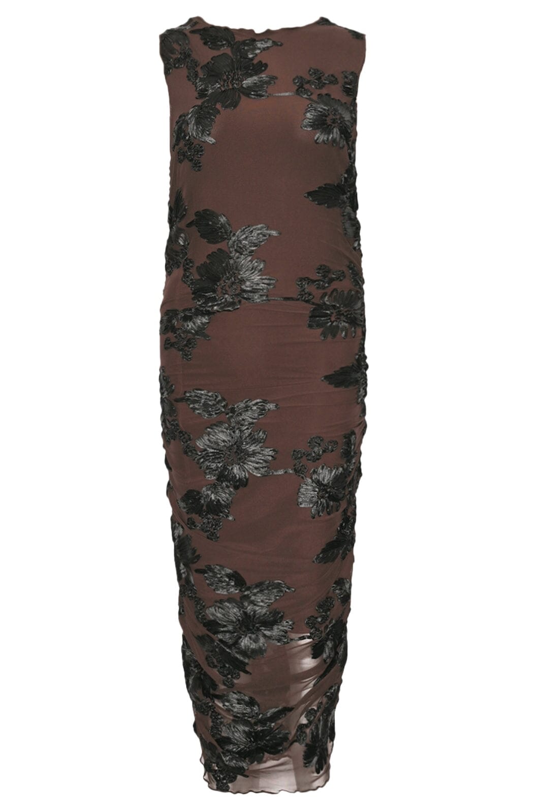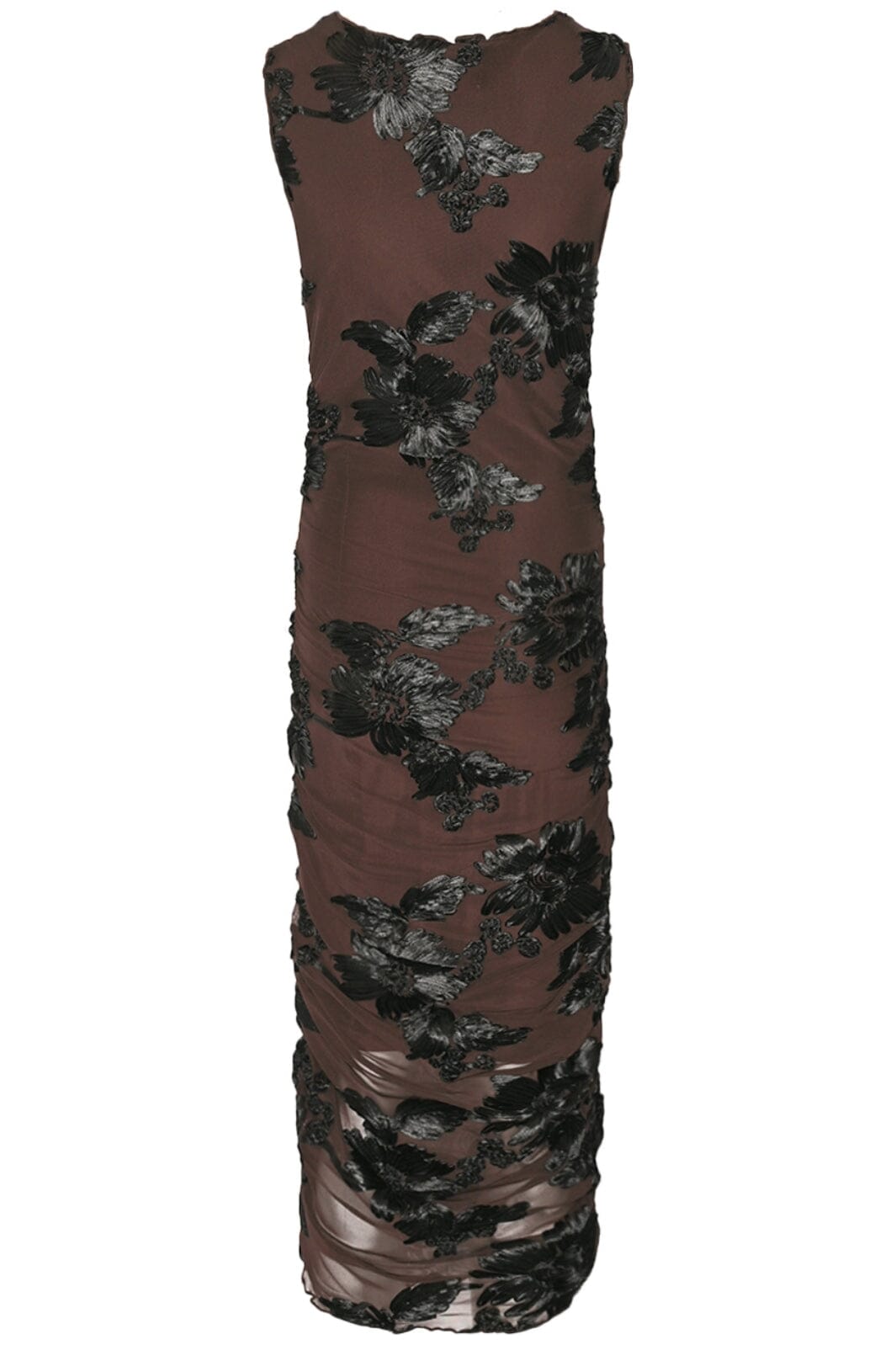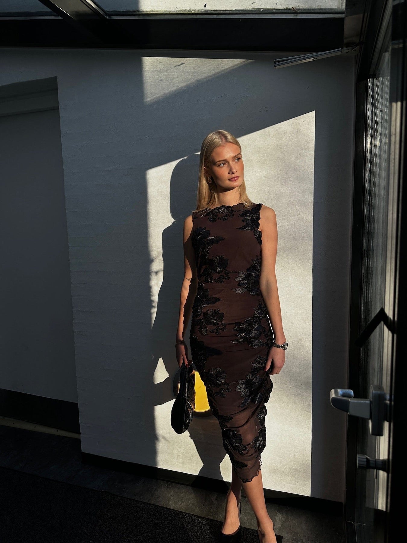 Bruine jurk van Noella met zwarte bloemenborduursel. Het aansluitende model heeft een lengte tot de kuiten en een mouwloos ontwerp met ronde hals.