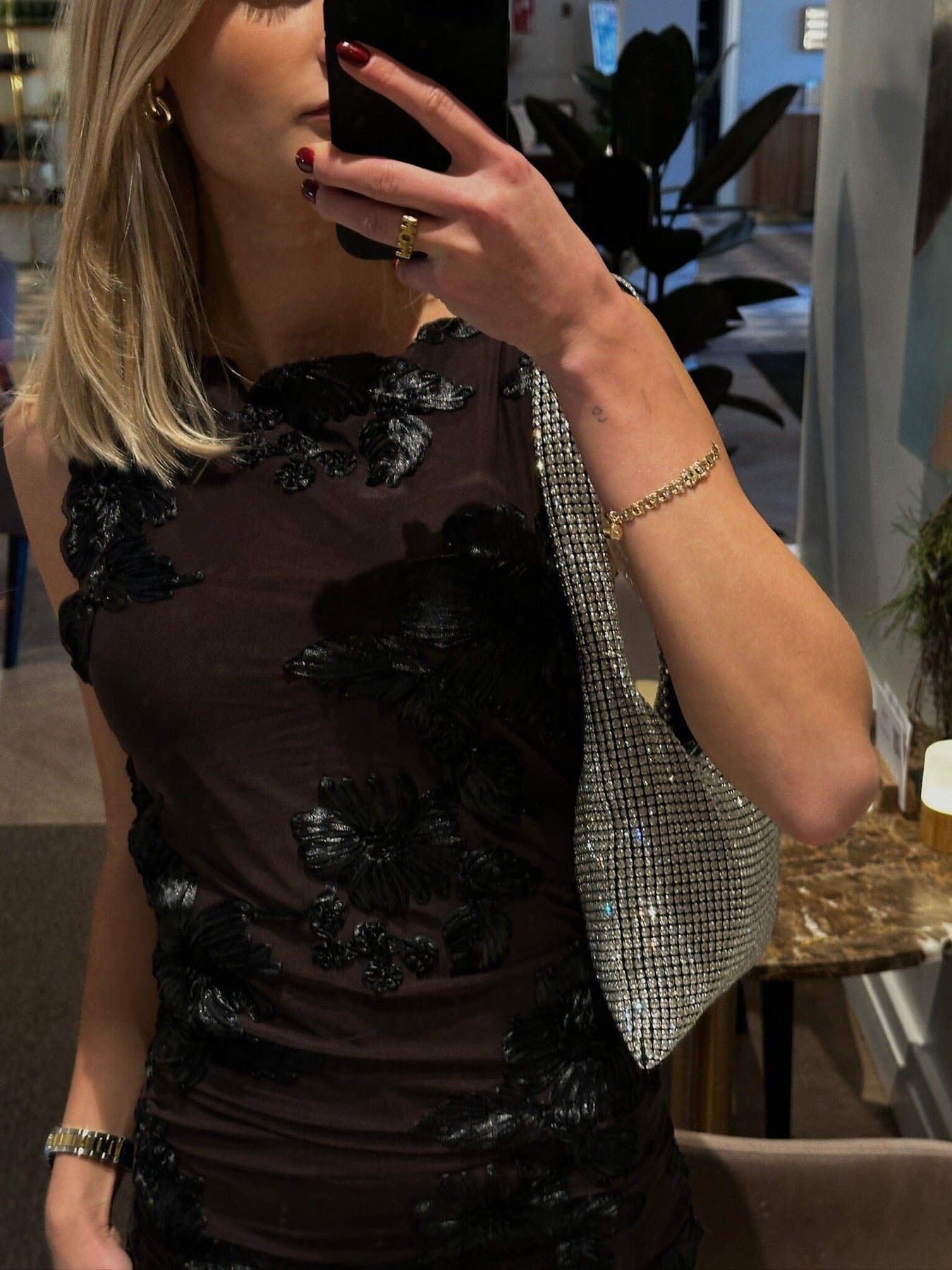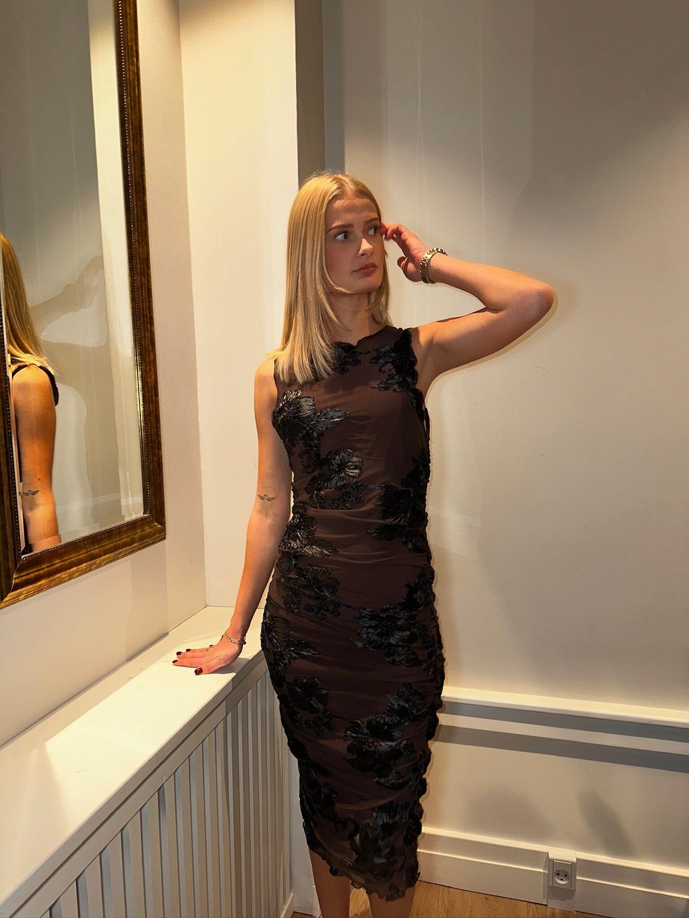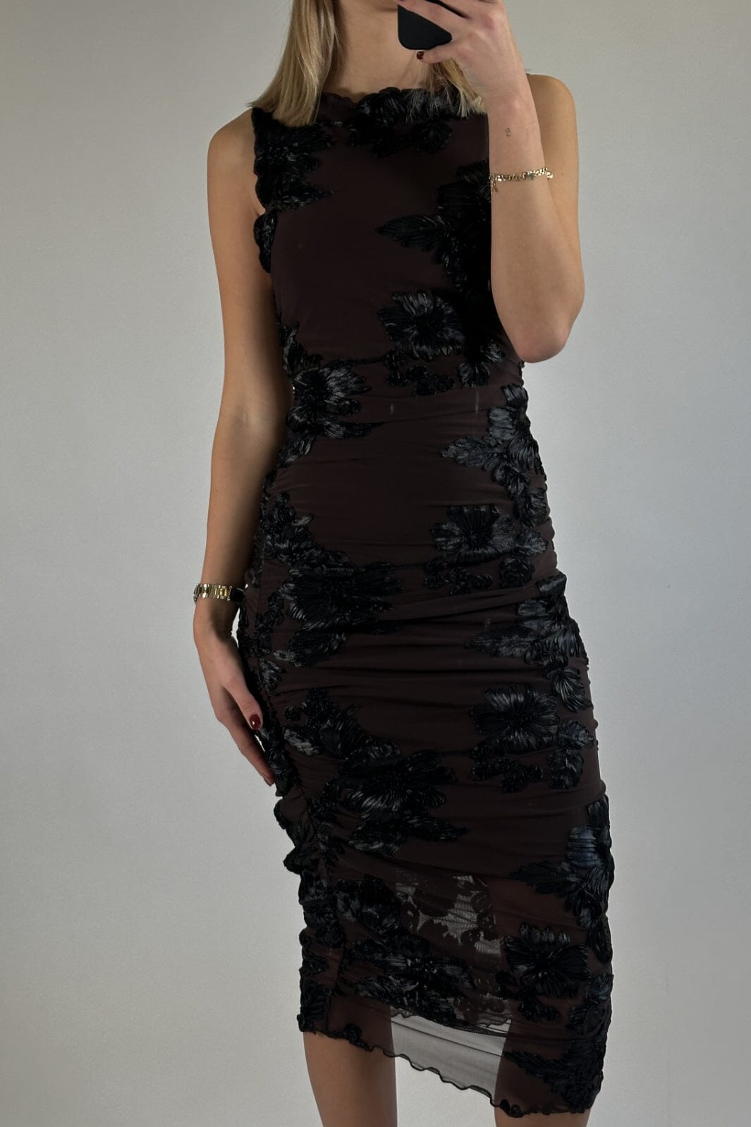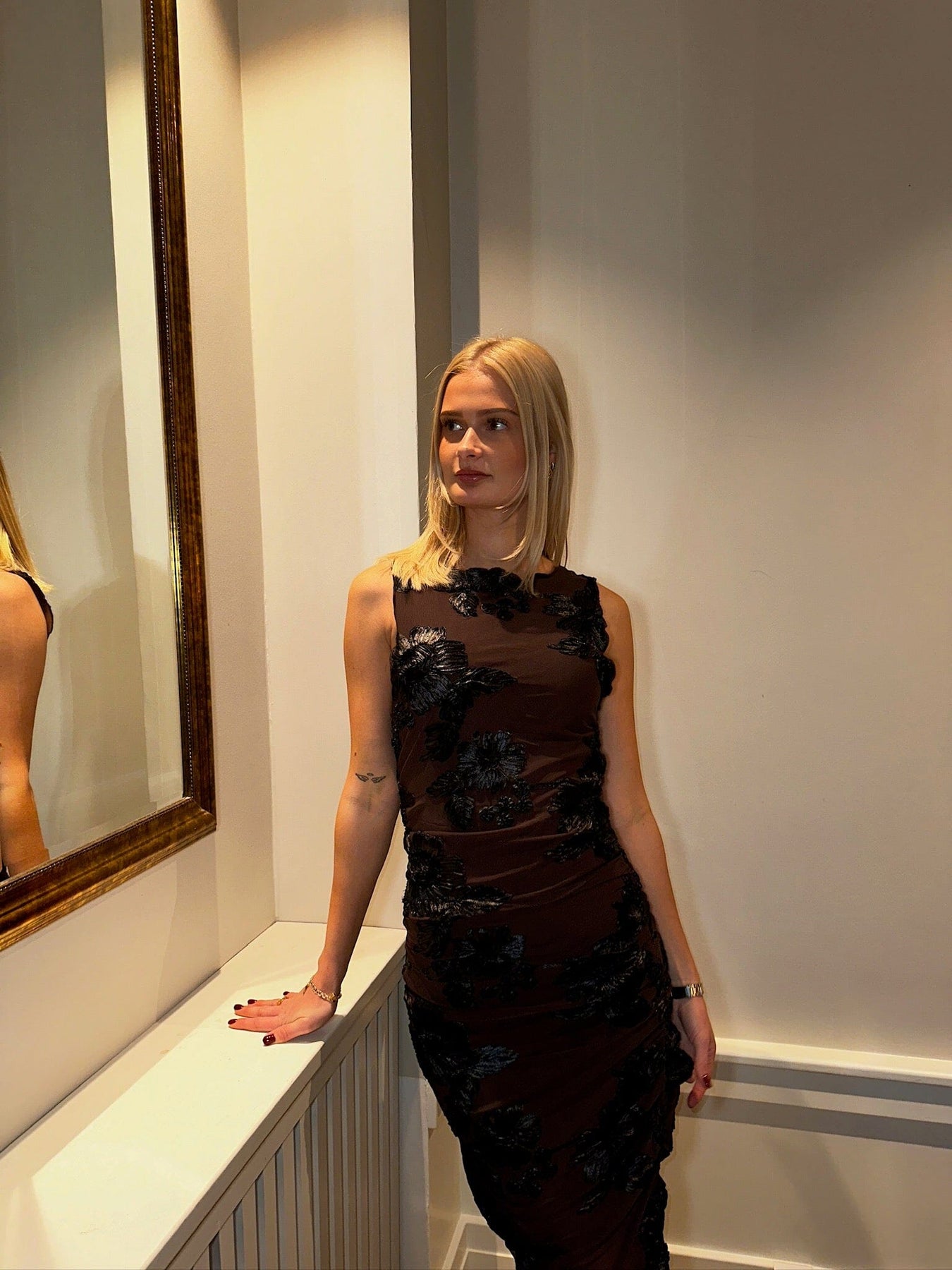 Bruine jurk van Noella met zwarte bloemenborduursel. Het aansluitende model heeft een lengte tot de kuiten en een mouwloos ontwerp met ronde hals.