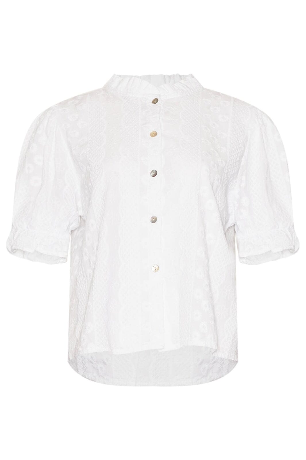 Witte blouse van Noella met borduursel en ruches. De korte puffmouwen en de hoge hals geven de blouse een vrouwelijke uitstraling. De knopen aan de voorkant maken het gemakkelijk om aan en uit te trekken.
