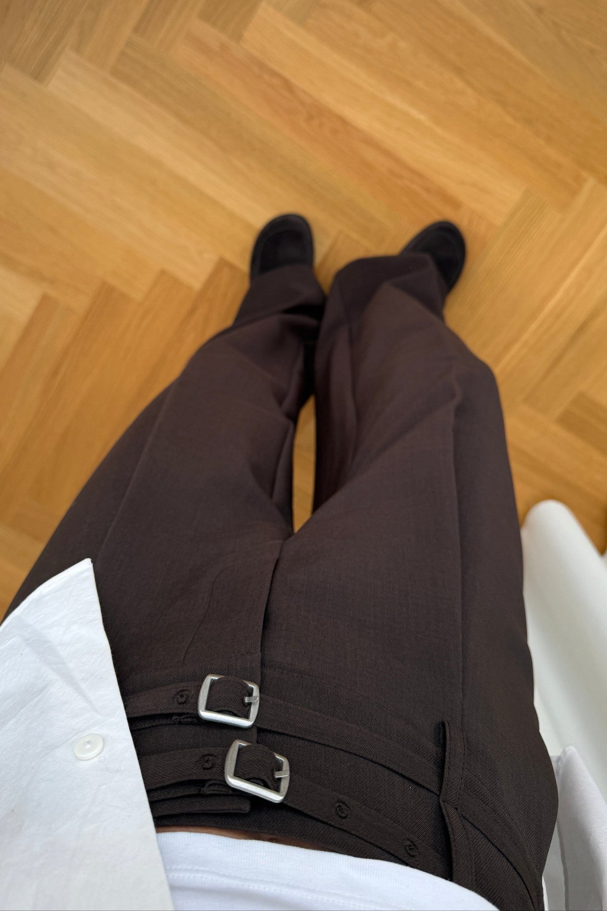 Bruine broek van Noella met een hoge taille en wijde pijpen. De broek heeft een losse pasvorm en reikt tot op de vloer.