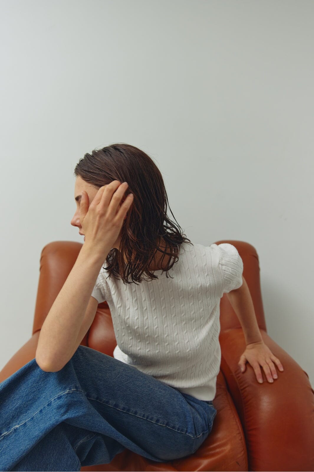 Kabelgebreide trui van Noella in een offwhite tint. De trui heeft korte mouwen en een ronde halslijn.