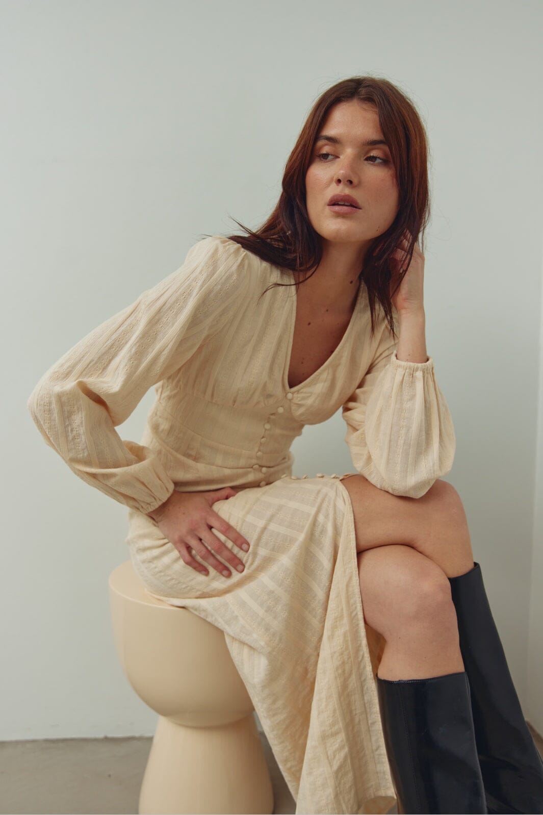 Lange jurk van Noella in offwhite katoen met V-hals, lange mouwen en knopen langs het midden. Hij is geschikt voor zowel alledaagse als feestelijke gelegenheden.