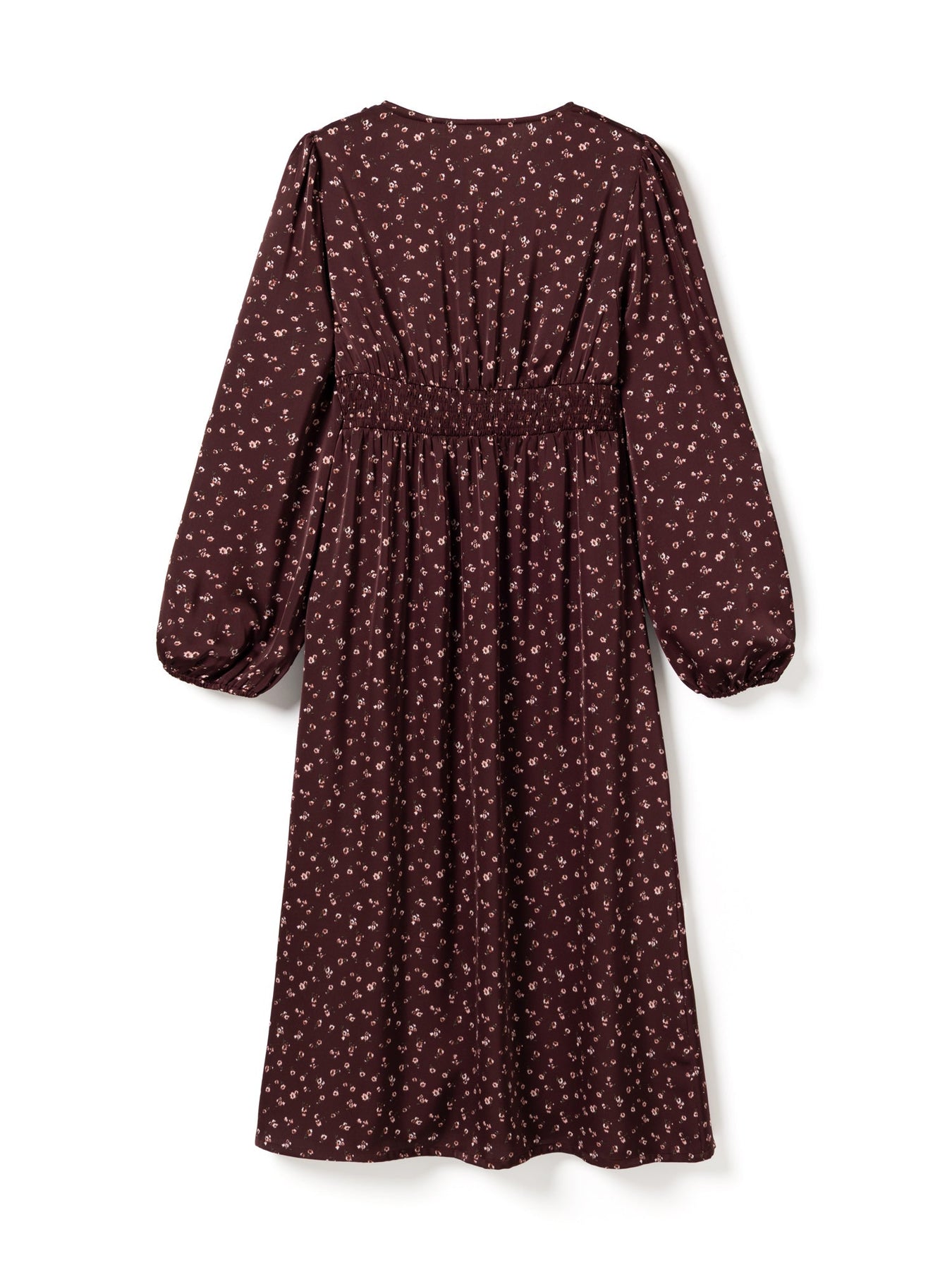 Donkerrode jurk van Noella met bloemenprint in bordeaux en rode tinten. De jurk heeft lange mouwen, een V-hals en komt tot halverwege de kuit.