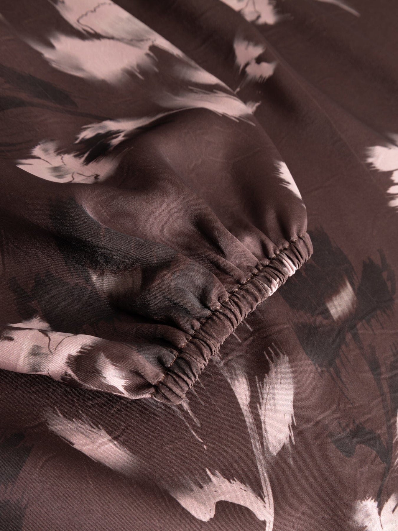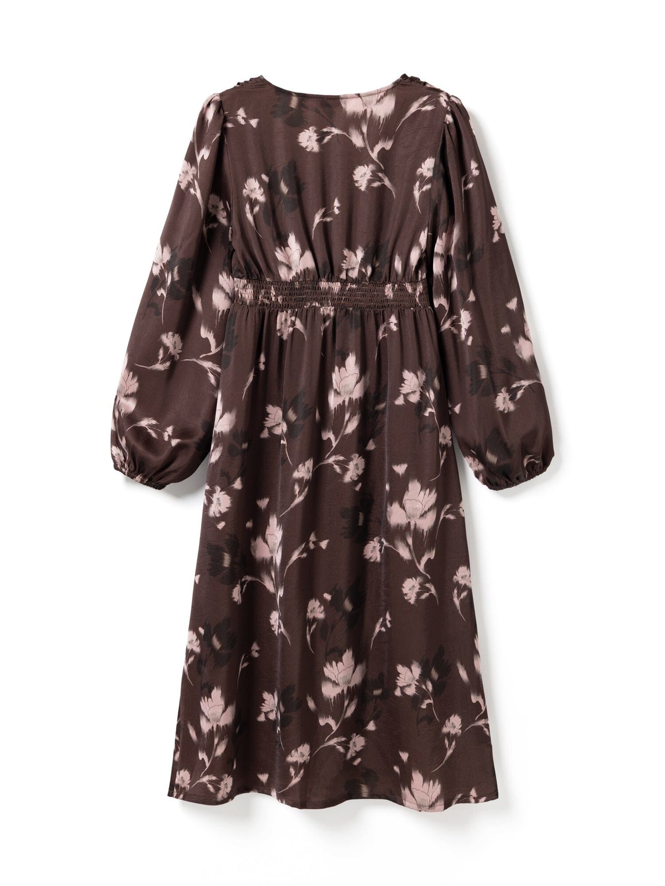 Jurk van Noella in bordeaux tinten met een bloemenprint in rode en bruine tonen. De jurk heeft lange mouwen, een V-hals met knoopdetails en een geaccentueerde taille.
