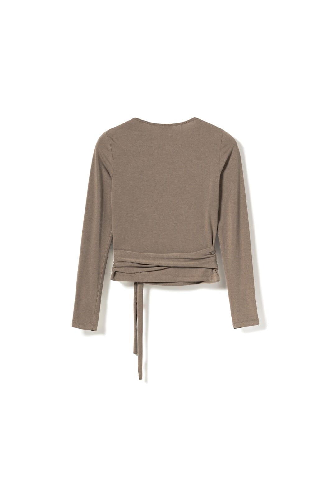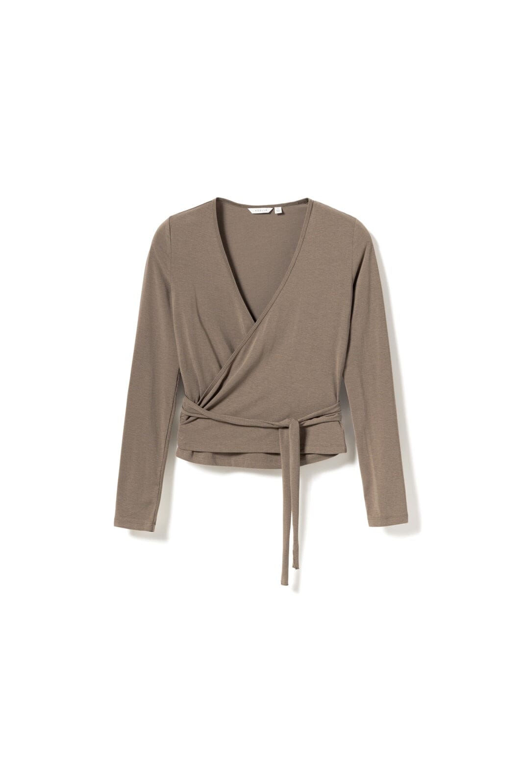 Top van Noella met overslagdesign in een grijzige bruine tint. De top heeft lange mouwen en een strikceintuur in de taille.
