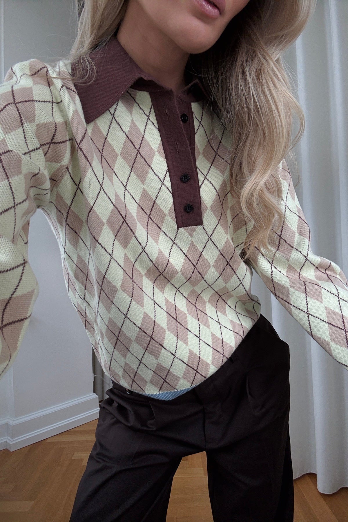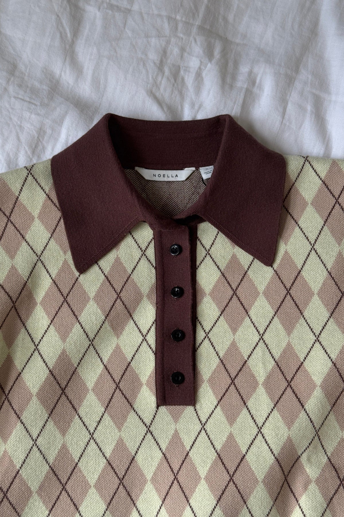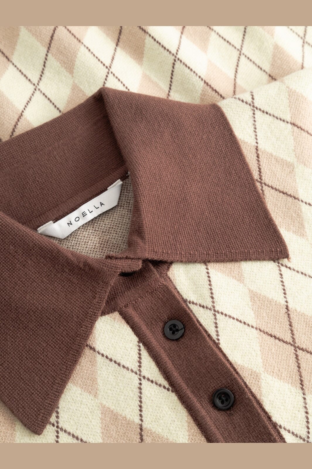 Gebreide trui van Noella in geel en bruin geruit intarsia-breisel. De trui heeft een bruine polokraag, lange mouwen met lichtblauwe boorden en een slim fit-pasvorm.