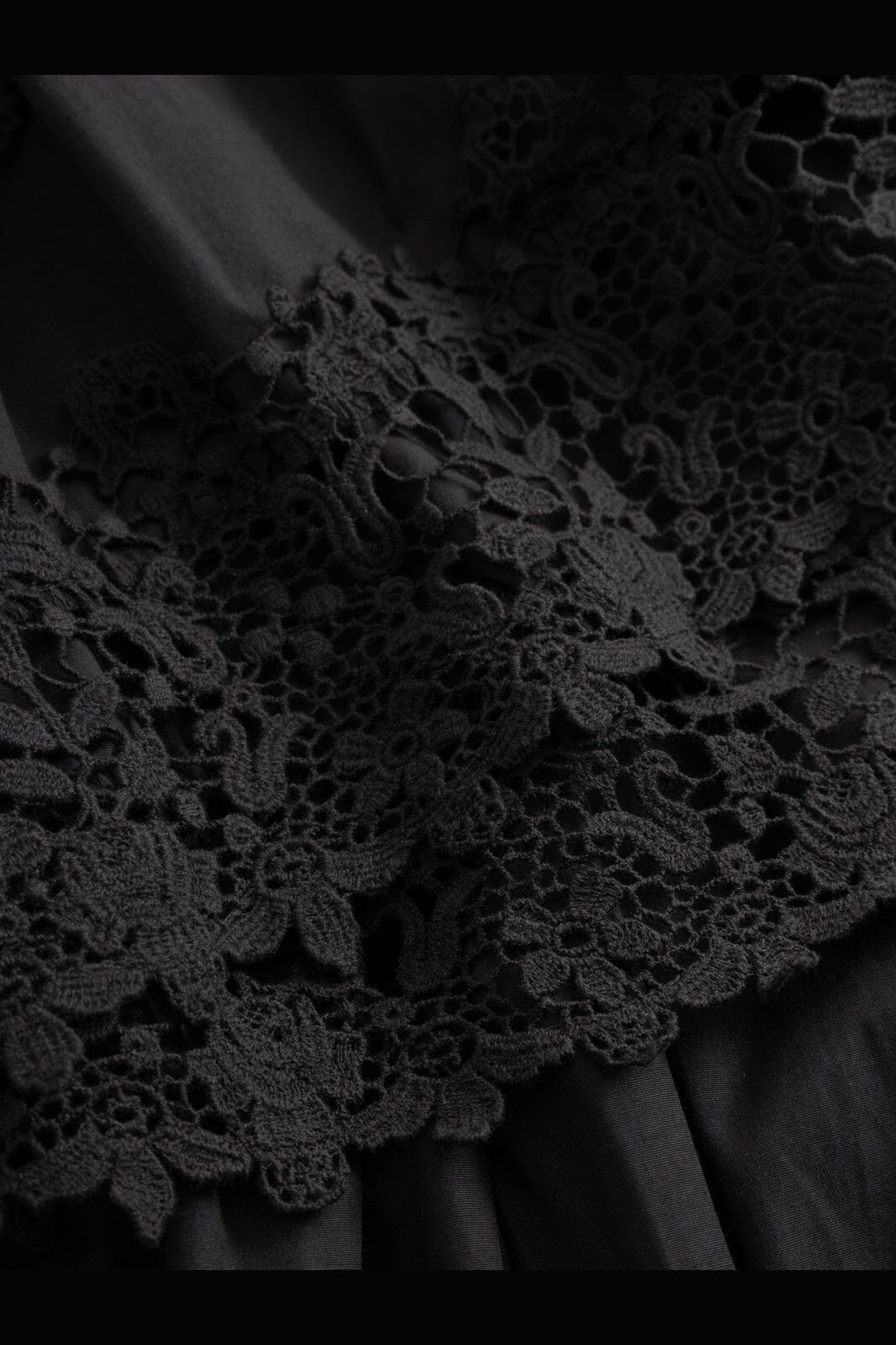 Zwarte jurk van Noella met borduursel, kant en ruches. De jurk heeft een hoge hals, 3/4-mouwen en een enkellange rok.