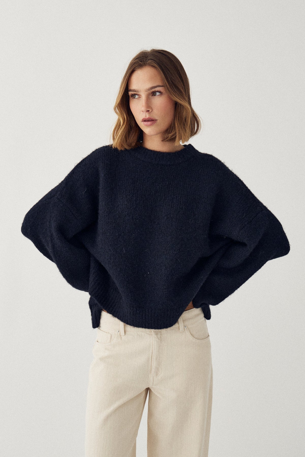 Donkerblauwe gebreide trui van Noella met een ronde halslijn en verlaagde schouders. De trui heeft een losse structuur en lange mouwen.