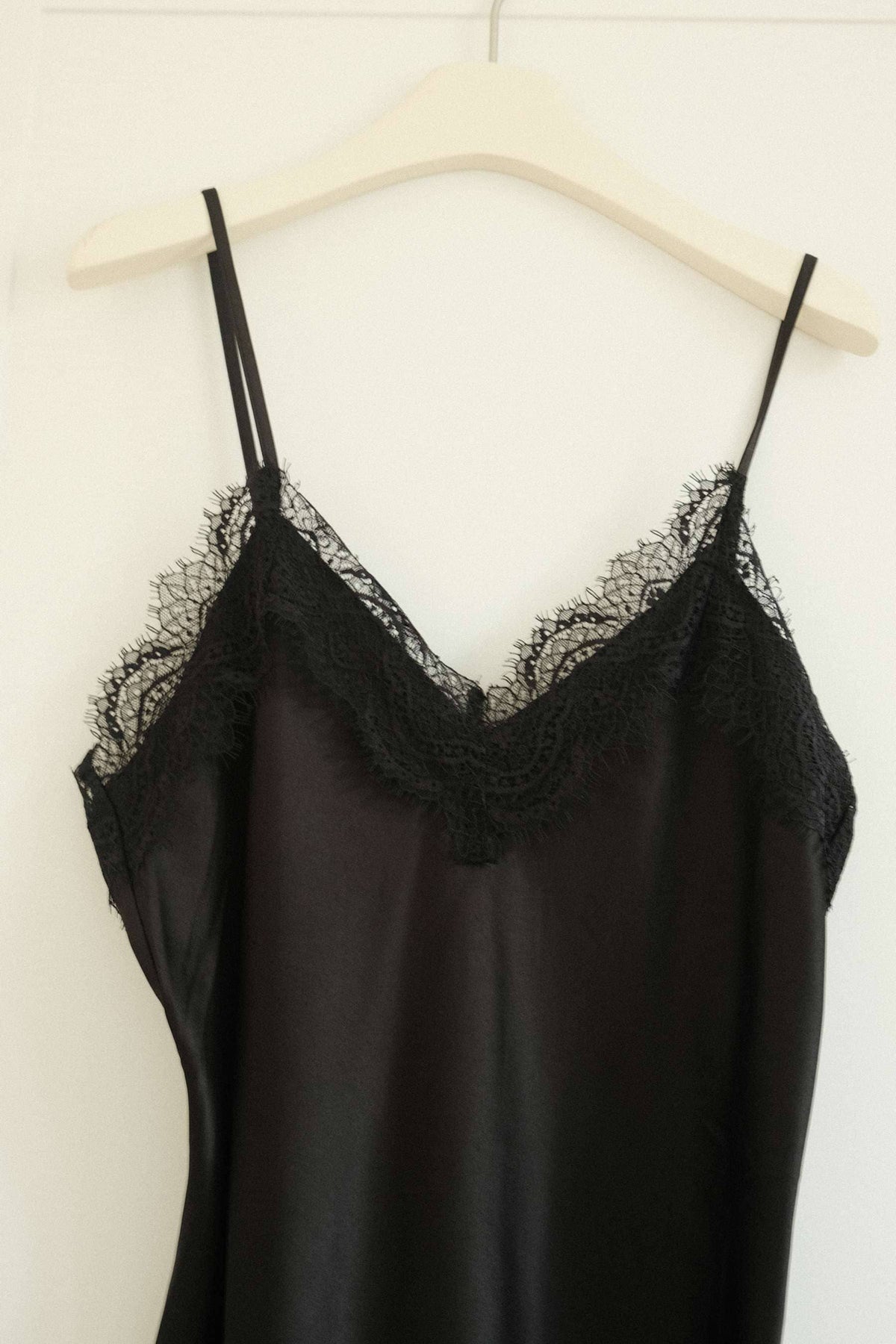 Zwarte satijnen jurk van Noella. De jurk heeft dunne, verstelbare bandjes, kanten details en een asymmetrische zoom die tot aan de knie reikt.