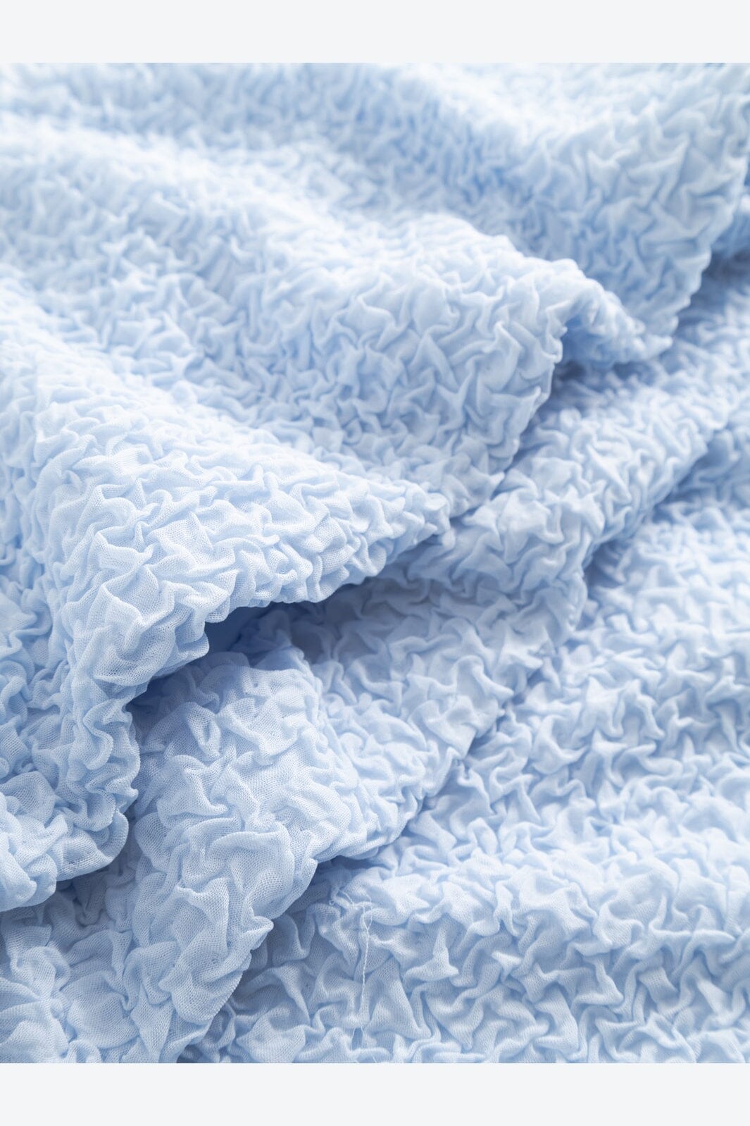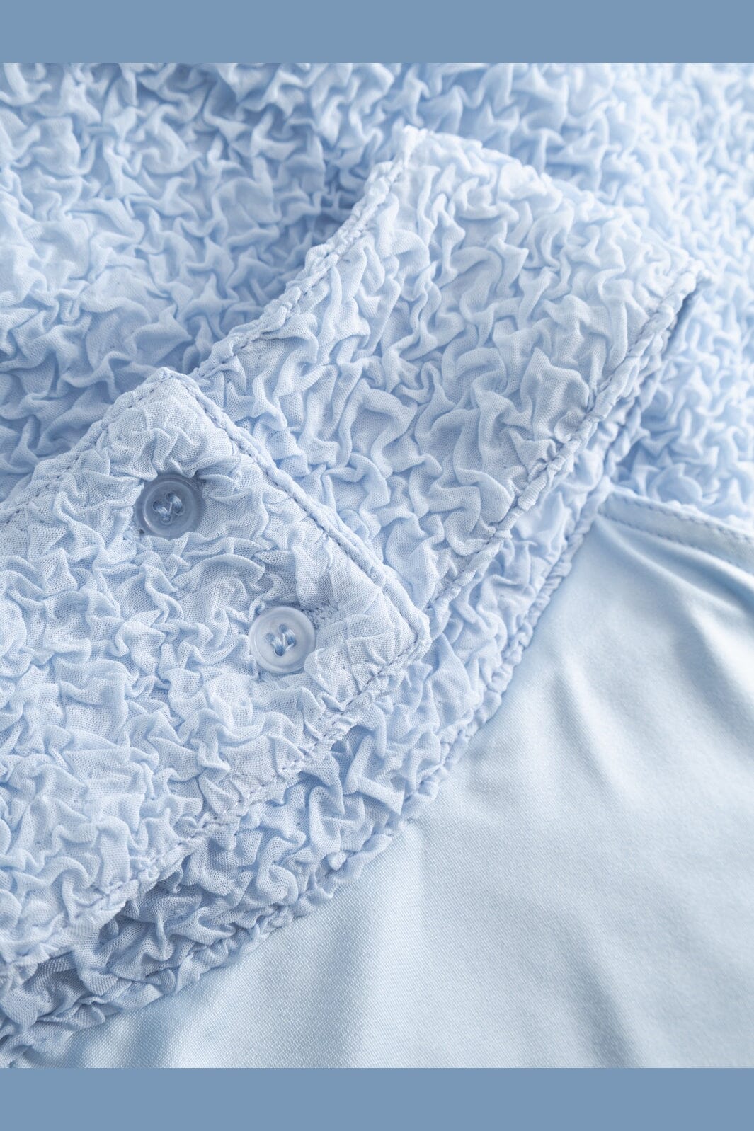 Lichtblau top van Noella, gemaakt van 95% polyester en 5% elastaan. De stof heeft een gekreukelde textuur die de top diepte geeft.