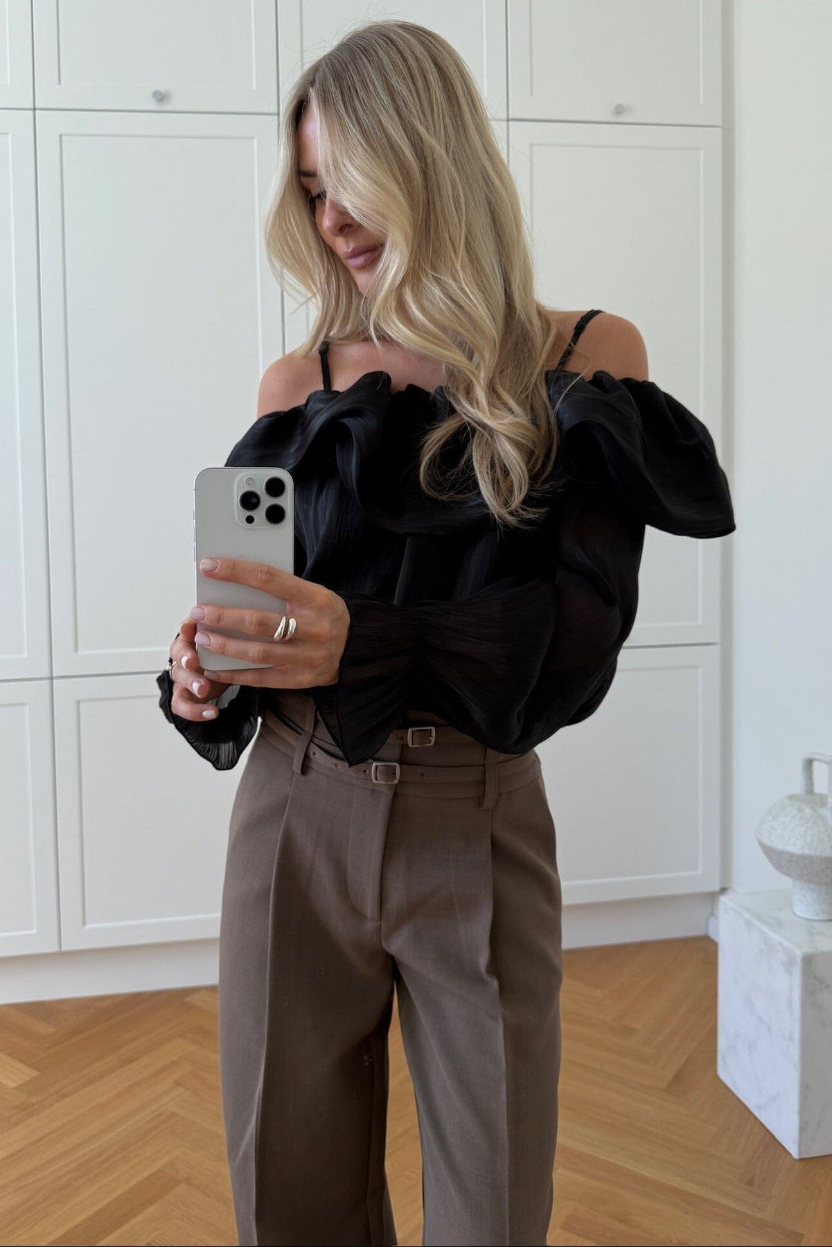 Zwarte blouse van Noella met off-shoulder design en dunne bandjes. De blouse heeft lange mouwen met elastische boorden en een grote volant bij de buste.